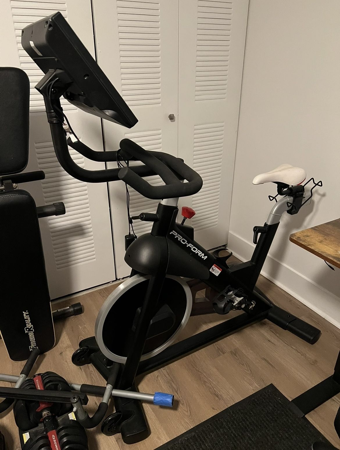 Stationary bike with weights Cool feature (Netflix on tablet)