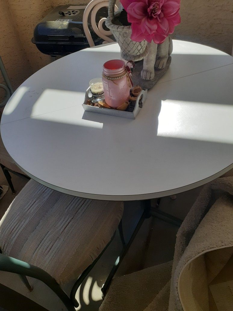 Round top table , with 4 four super comfy cushions chairs, two painted pink color and two grey color. Hurry it won't last long!