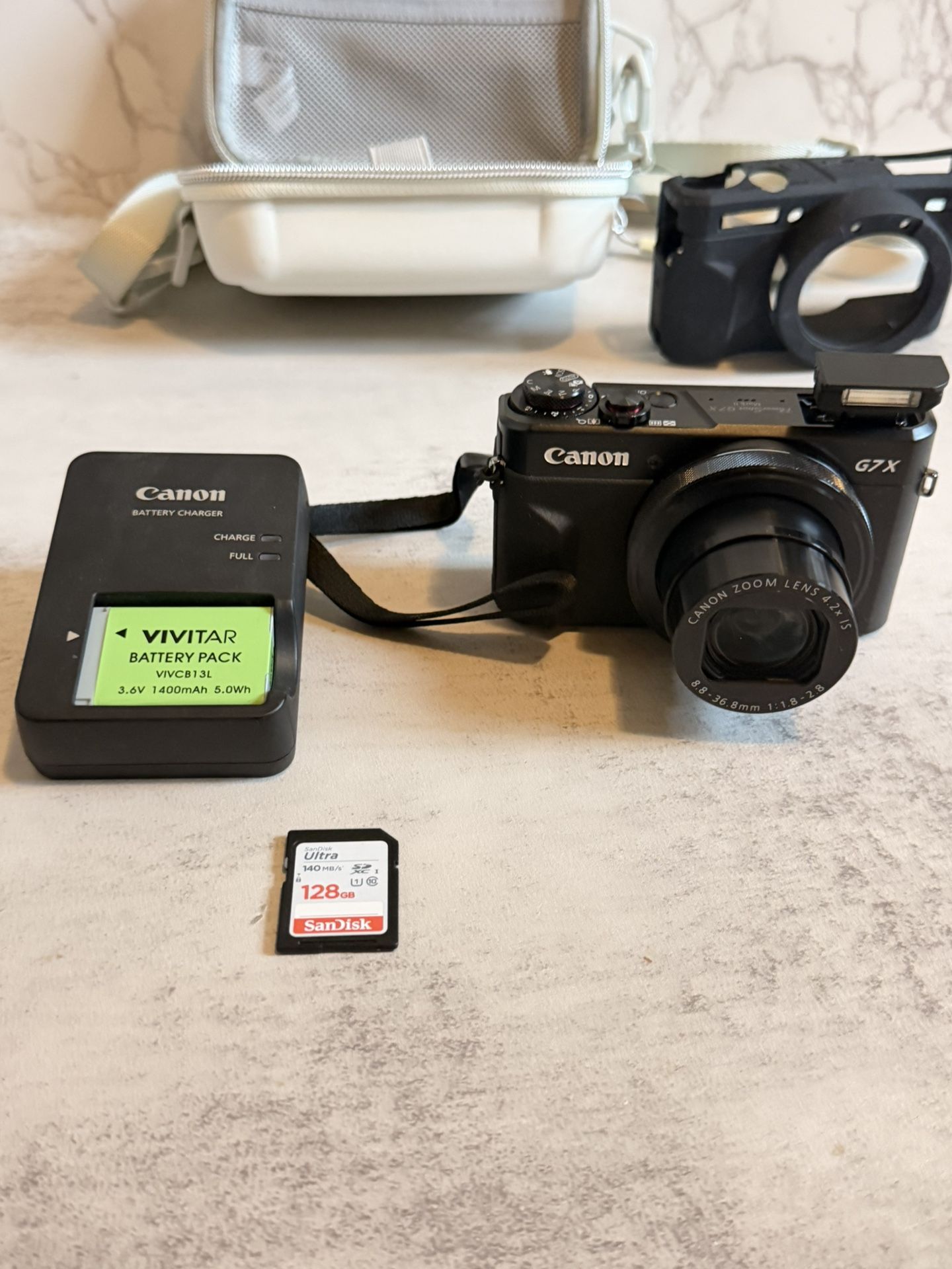 Canon PowerShot G7 X Mark II digital camera in excellent condition. Used only twice, works perfectly, no scratches or issues. Included in the bundle: • Canon PowerShot G7 X Mark II camera • 2 batteries + charger • 128GB SanDisk SD card • Protective hard camera case • Silicone camera cover • Wrist strap Flip-up screen works perfectly, lens is clean, and camera has been very lightly used. Perfect for YouTube, Instagram, TikTok, vlogging, content creation, and travel. Reason for selling: Not using it.