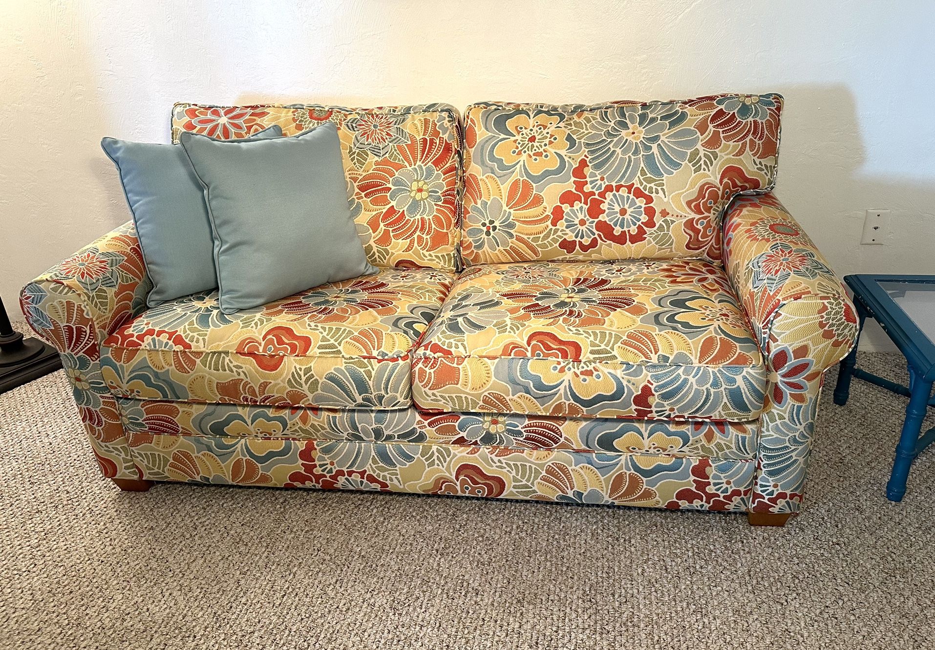 Fabulous air over coil technology with the sleeper system. Bought at Havertys and works beautifully. No pets! No smokers and rarely used and colors are vibrant. Pull out the sofa and press the remote, and it inflates or deflates. Super comfy. 70” L x 35 “ W and mattress super comfy. Mattress size 70” x 52”. Must call to see in person to appreciate. Colors are vibrant, no stains or fading. Buyer must remove and it’s in a condo. I received some sort of message of interest and it disappeared. Please resend message if it was you.