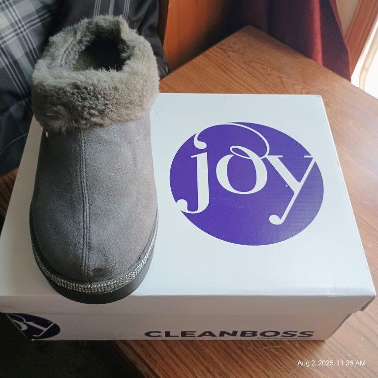New women's slippers never used still in box. Size 5w Upper: Fabric Trim: Faux fur collar; rhinestone embellishments Design: Slip-on Toe Type: Closed, round Back: Deep heel cup Lining: Faux fur Insole: Padded gel for arch support Sole: Rubber