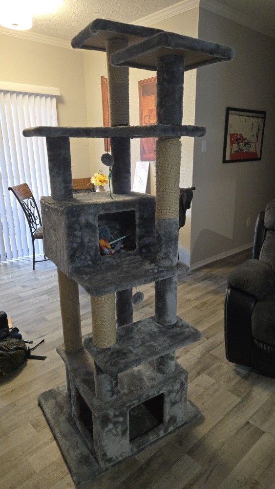 Clean and In really good condition. Minimal use. The close up post pictureof one scratching post is the only visable wear on it. Breaks down easy and could be put in a car if needed.