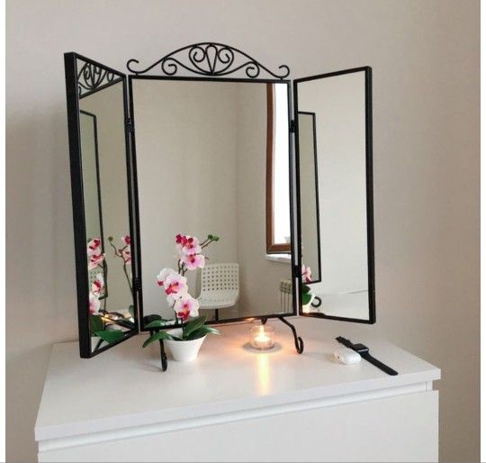 Black trifold mirror. Excellent condition Paid $90 … perfect for your or kids rooms . sides fold in and have hooks on the back for jewelry. 29” high 16” wide closed 33 1/2” wide open. 25. Cash Venmo or PayPal