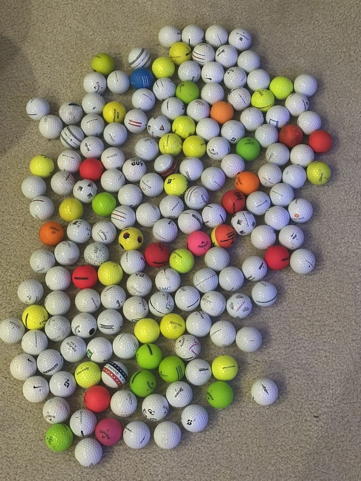 Roughly half a 5 gallon buckets worth of golf balls that have been found at golf courses. They are used golf balls, so I cannot guarantee that any single golf ball is in great condition. However a majority of them are in pretty good condition. Starting at $50, taking best offers after that. This stash has a wide variety of golf ball brands.