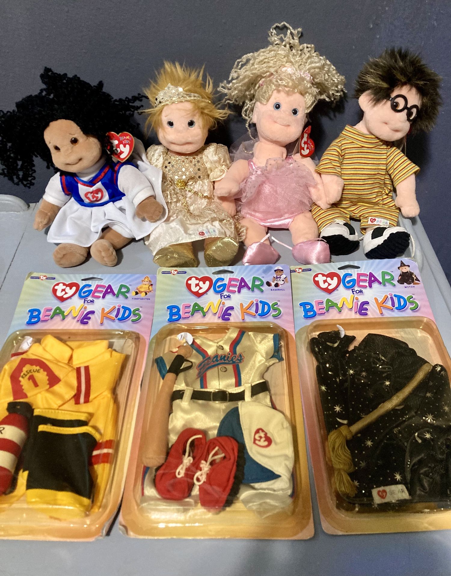 4 Beanie Baby Kids all wearing outfits + 3 more out fits in the box. Baseball, fire fighter and witch. Beanie babies are Calypso, Chipper, Blondie and Specs.