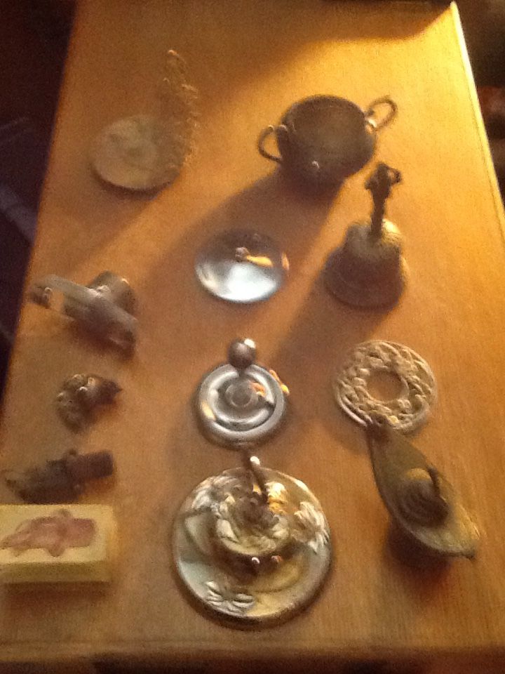 Misc. brass, copper and sterling silver items... Jeanie lamp, old ringing bell, two antique wine bottle toppers, and some candle snuffers ect. Asking $5.00 and up. Or $160.00 cash for whole bundle. Or make me an offer. I've alao included some example ads for price comparisons.