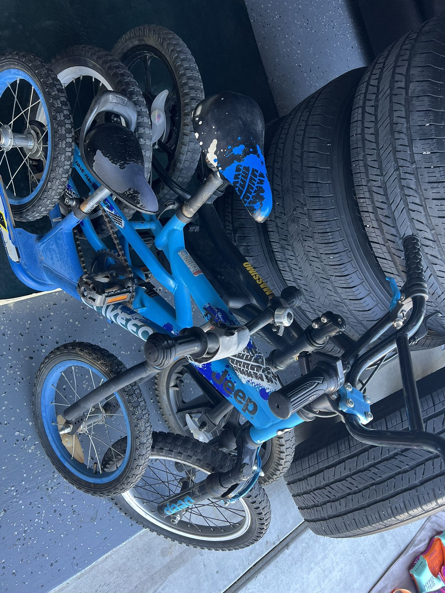 Black Electric Bike - 1 spare tire and charger ($100) 1 balance bike ($5) 1 kids bike ($5)