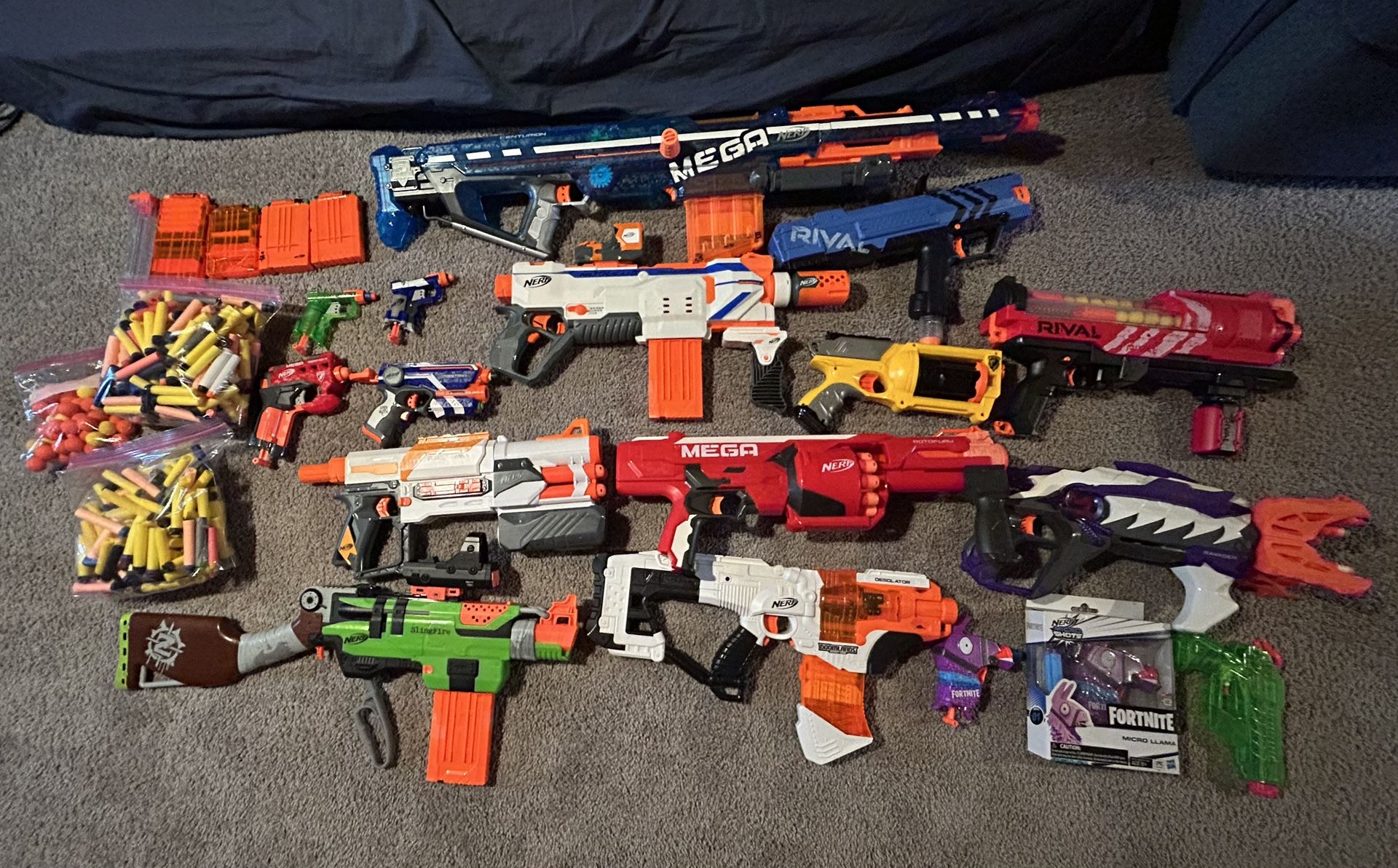 16 used blasters in fair to good condition, some with accessories, all are functioning (batteries may be needed for some), 5 spare magazines, 3 bags of assorted darts, and 1 water pistol.