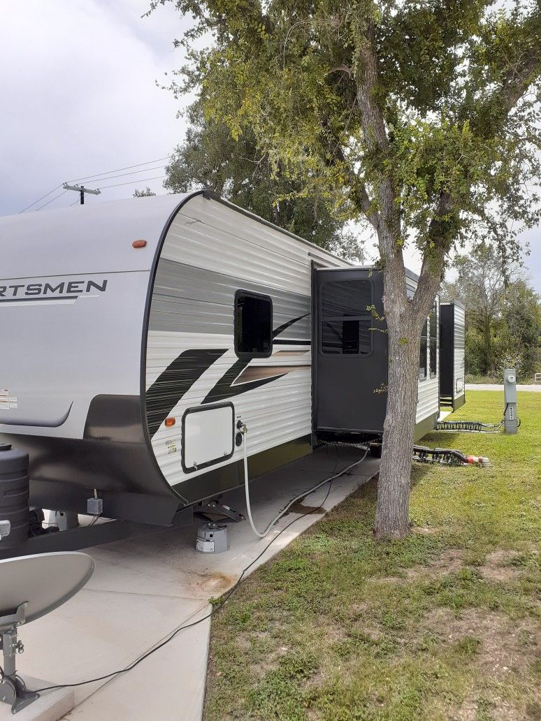 2 bed/1 bath, 3 slides. Electric fireplace, TV in living room, stackable washer/dryer, New porcelain toilet, both air conditioners work good, heat never used as fireplace warmed rv. Brand new stove and oven as it was never used. Residential refrigerator, Tankless water heater. Nice size closet and built in dresser in main bedroom. Portable aluminum deck with stairs on one side and ramp on other side. Clear title. One owner Make offer
