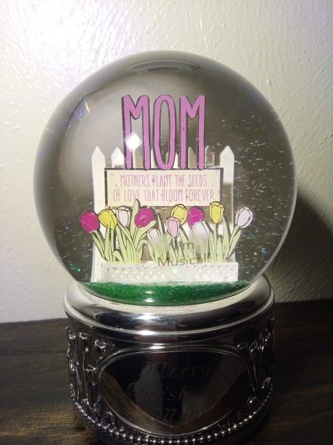 Celebrate mom with this enchanting musical snow globe. Features pink and yellow tulips and Merry Christmas Mom etched in the silver base. "Flower Song" musical base by Things Remembered Smoke free In original packaging No cracks or breaks Cash or Venmo only Pick up in Chesapeake 23323 near Deep Creek High School No holds Musical Flower Song Etched Merry Christmas ๐ Mom Tulips ๐ท Snow Globe Shaker