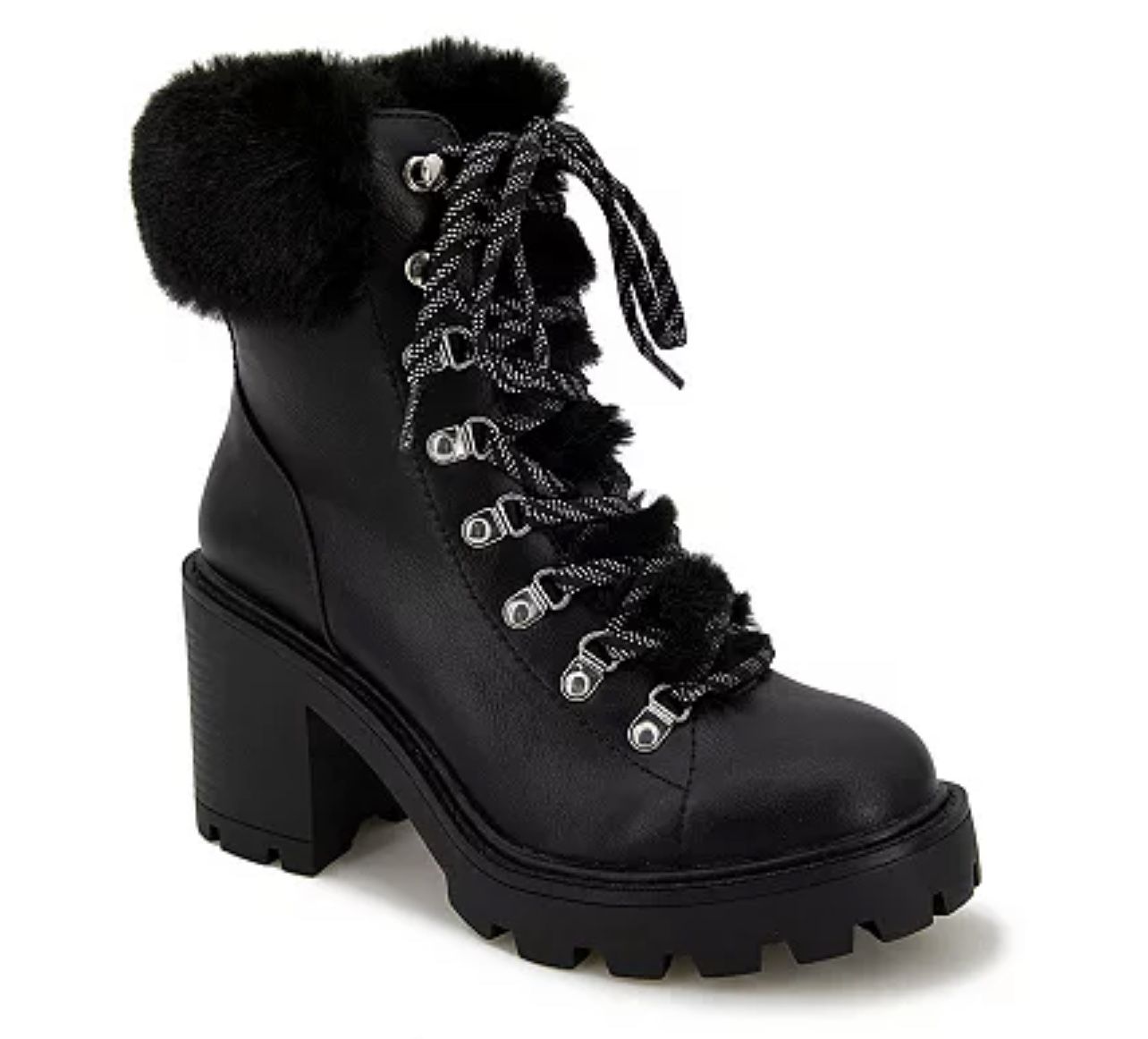 NWT BLACK SIZE 8 BRAND: E-SPIRIT $78.99 RETAIL PRICE Heeled hiking boot SHOE FEATURES Faux fur detail upper Chunky platform design Foam footbed for all day comfort Zipper closure for a secure fit SHOE CONSTRUCTION Synthetic upper Polyurethane lining Foam midsole Rubber outsole SHOE DETAILS Round toe Zipper closure Foam footbed 2.5-in. heel 0.25-in. platform 5-in. shaft 10-in. circumferences