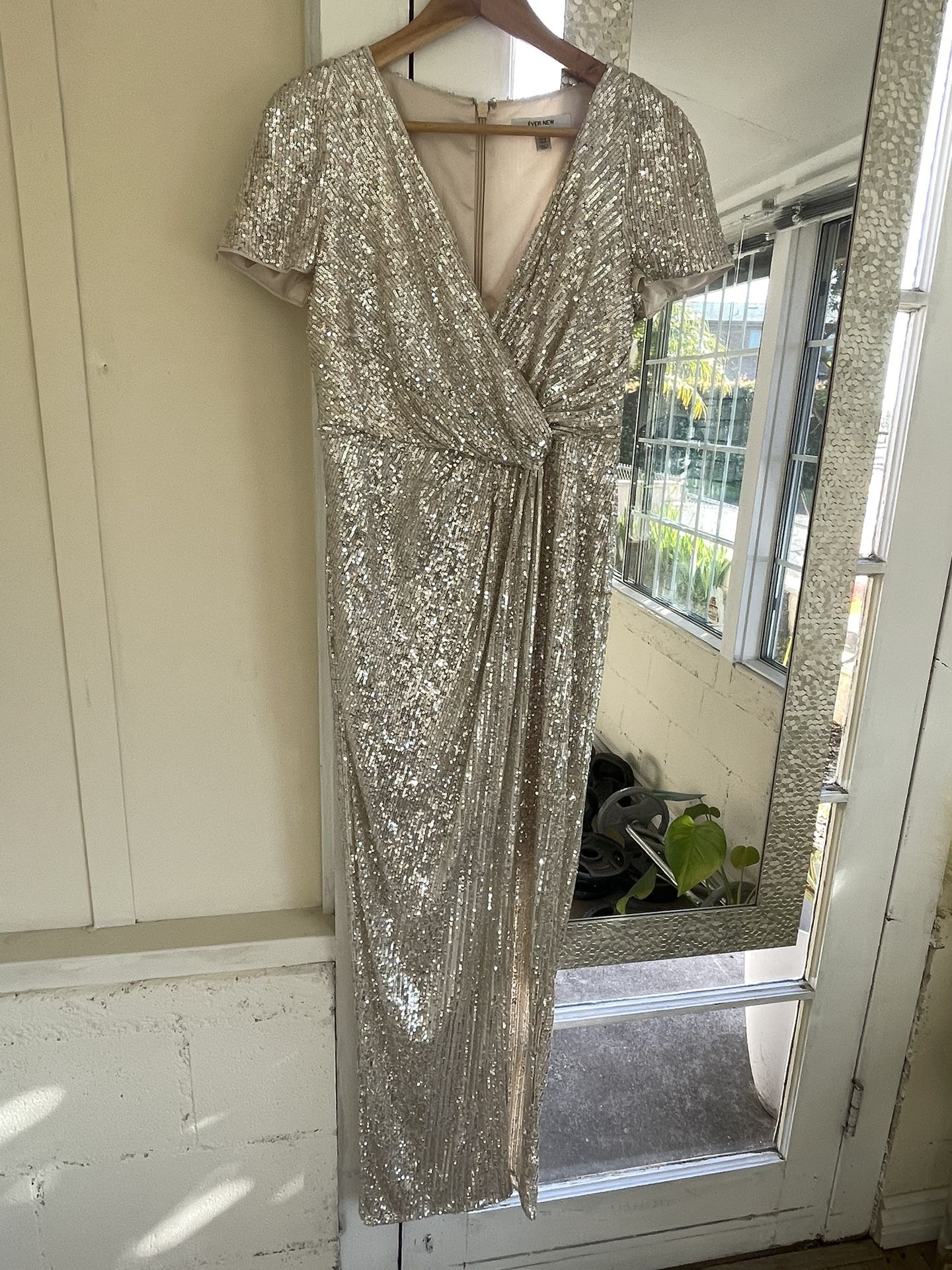 Women’s size 10. Gorgeous and glamorous with maximum sparkle, this stunning sequin dress is a stellar option for that upcoming formal event, black tie wedding, prom or formal gala in style with this champagne sequin gown, which features a flattering v-neckline and short sleeves, while the back of this beautiful evening gown features a hidden back zipper closure and clasp. Deep V-neck, no stretch, lined, no built-in bras, front wrap, sequin evening gown. Perfect as evening dress, fall/winter dress, bridesmaid dress, formal dress, prom dress, wedding guest dress, party dress, cocktail dress, ball gowns, banquet dress, night out, clubwear, gala, performance.etc multiple use dress.