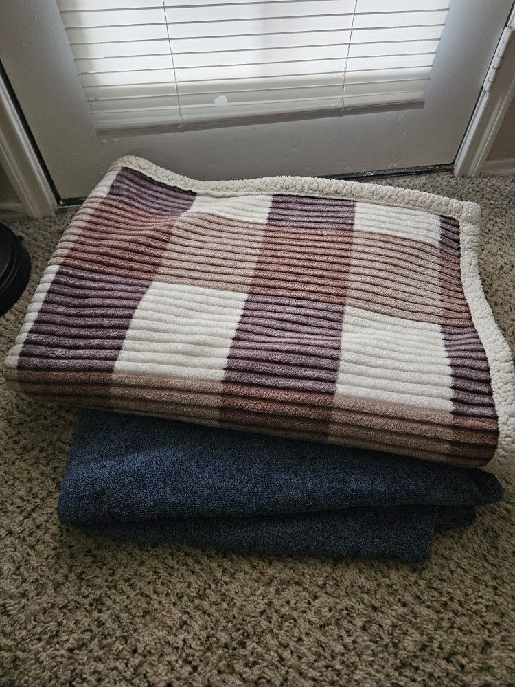 Two large blankets for sale in excellent pre-owned condition. Patterned is 60×80 inches. Blue is 90×90 inches and Mainstays brand. Price is for both together.