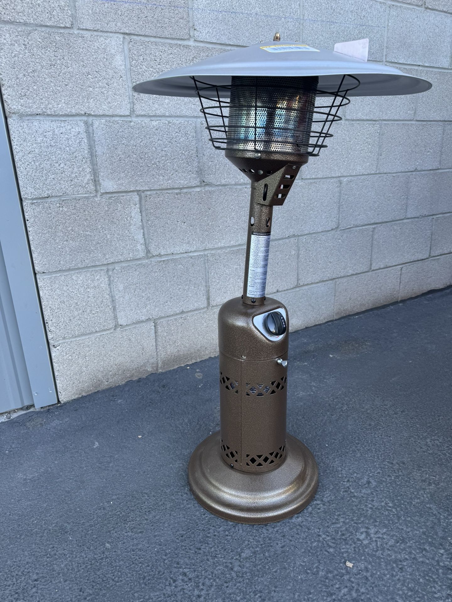 HeatMaxx Portable Patio Heater, Outdoor Propane Table Top Heater, Bronze Has a bend and a couple dents on top other wise it’s basically new still has the propane tank works great no issues