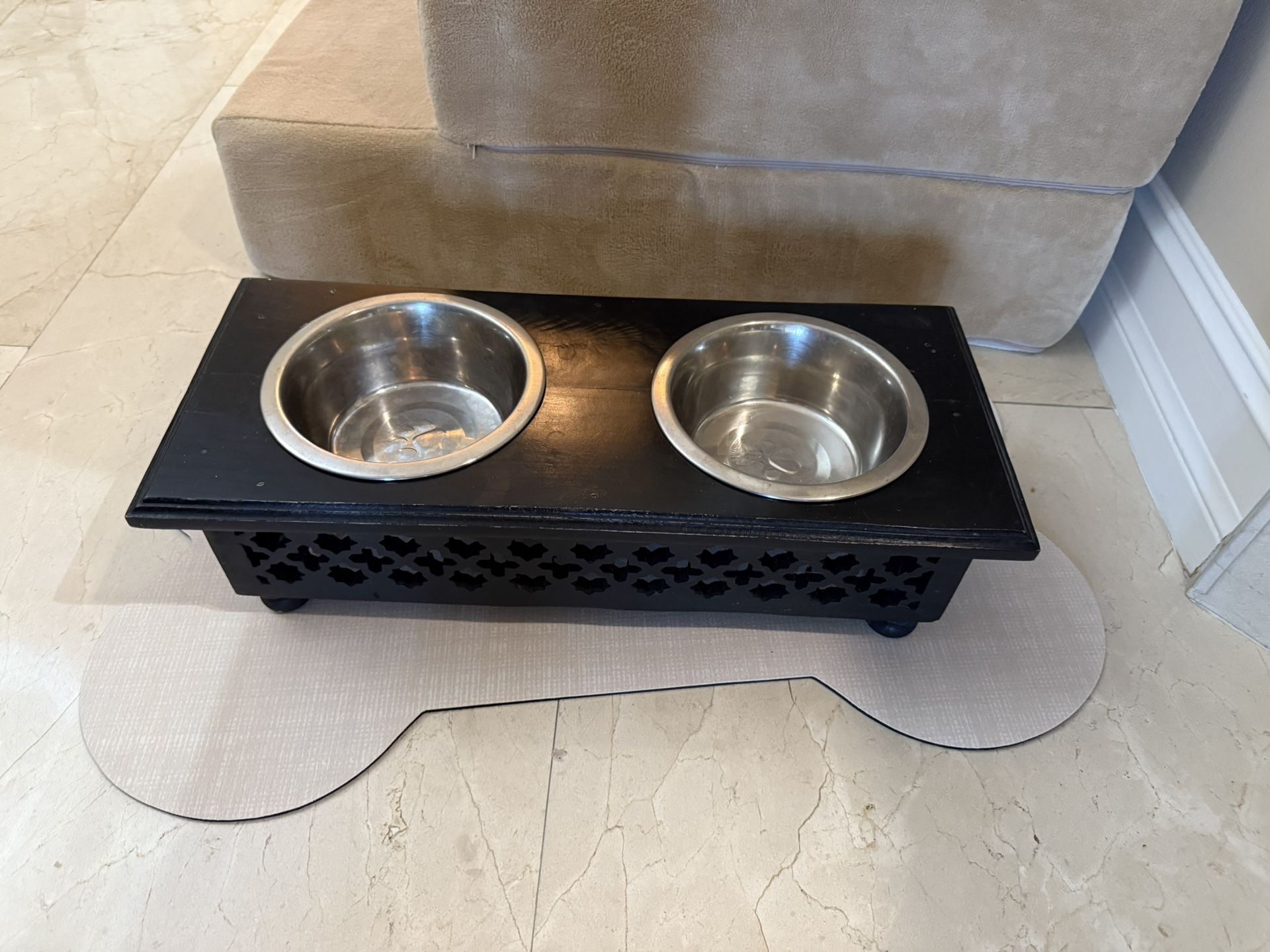 Joy elf dog bed washable Washable tan/ cream stair case no stains almost new used just under a month great condition Food and dish bowl with holder Anti slip water and food dish place mat Unfortunately our little guy was old and we had to make a heartbreaking choice so he was no longer in pain