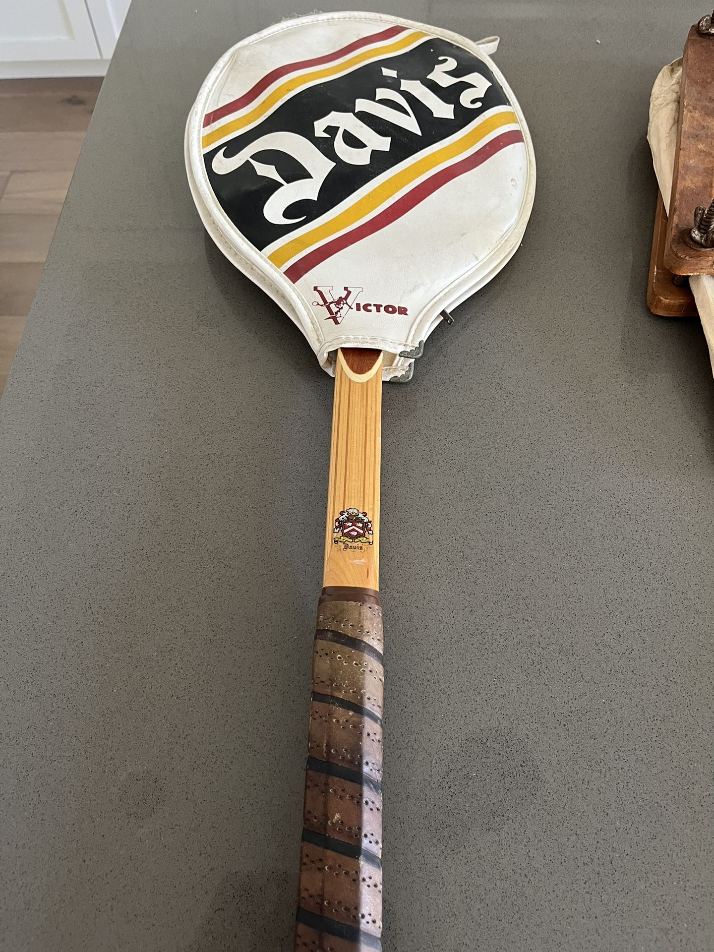 2 vintage Davis Hi Point Tennis rackets. One has the zephyr metal brace frame and Davis cover. Excellent condition. The other vintage Davis Hi Point Tennis racket has a wooden brace frame and original Seattle Athletic supply cover. Excellent condition. $19 each