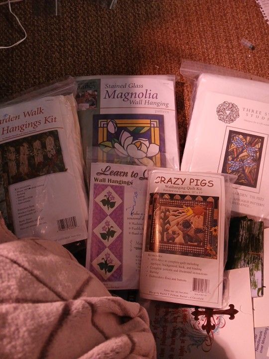 2 sewing with nancy 1 three swans studio dragon fly garden Crazy pigs 15 "x13 Learn to quilt wall hanging violets Keepsake quilting Victorian windows 48x44 Loretta gate laser cutz Beads point