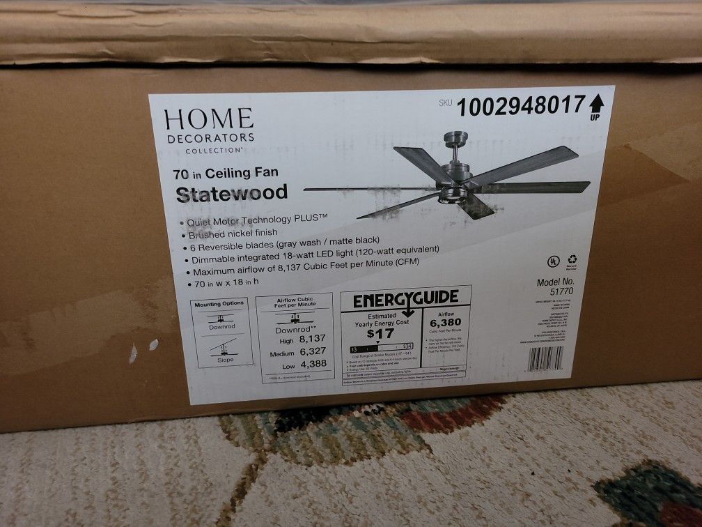 The 70 in. Statewood ceiling fan from the Home Decorators Collection. This ceiling fan features a modern light kit, brushed nickel finish and six reversible, matte black/gray wash blades that complement many decors. It's easy to get the perfect settings with the remote, which controls the speed functions, independent light and the Comfort Breeze feature for a natural breeze effect. The 18-W LED light is dimmable and requires no maintenance. Dimmable integrated 18-W LED light kit (120-W equivalent) Brushed nickel finish Six reversible blades in gray wash and matte black finish Includes feature-rich remote control Powerful three-speed reversible motor Perfect for large rooms 20 ft. x 20 ft. or bigger Slide-on mounting bracket for easy installation Concealed hardware for added style and beauty Dual-mount fan can be installed on a flat or angled ceiling Compatible with 3/4 in. dia. extension downrods Original price $160 Only asking $80