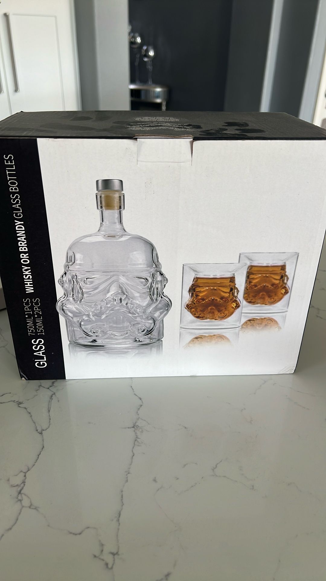 Glass storm trooper whiskey or Brandy glass bottle and two 150 mL glasses. New price to sell makes a great gift for Home or Office.