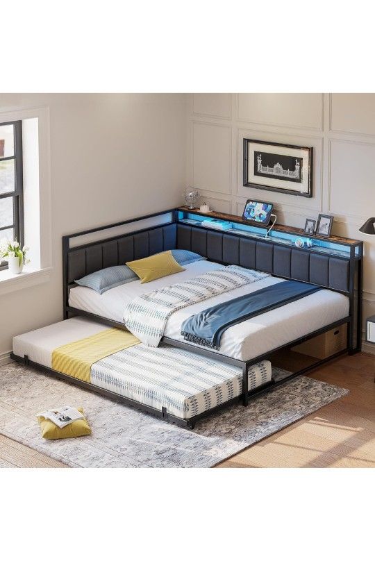 LIKIMIO Twin Bed Frame With Trundle +LED Lighs +USB Charging