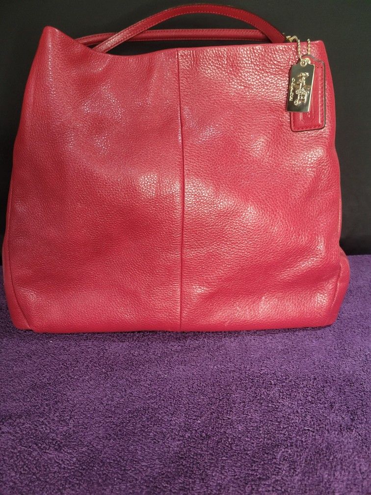This is a Coach Madison Phoebe shoulder bag in red pebbled leather with gold-tone hardware.