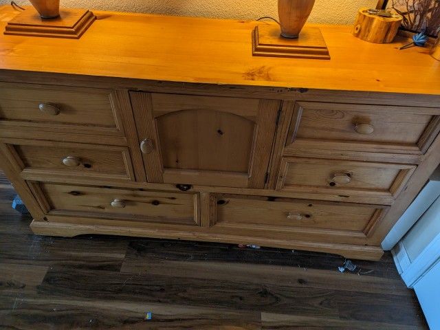 🌿This dresser is SOLID, heavy and well made It has 6 drawers One cabinet in middle Has a small white mark in top (left) as pictured Also has a scratch on top ( right side) as pictured All drawers work fine except top right drawer drops down when opening, but is still fully functional measurements: 34" tall 18"deep 62.5" wide Price is $150 FIRM Bring a truck and help pick up off cirby/Sunrise NO HOLDS Lamps are also for sale * Check my other listings
