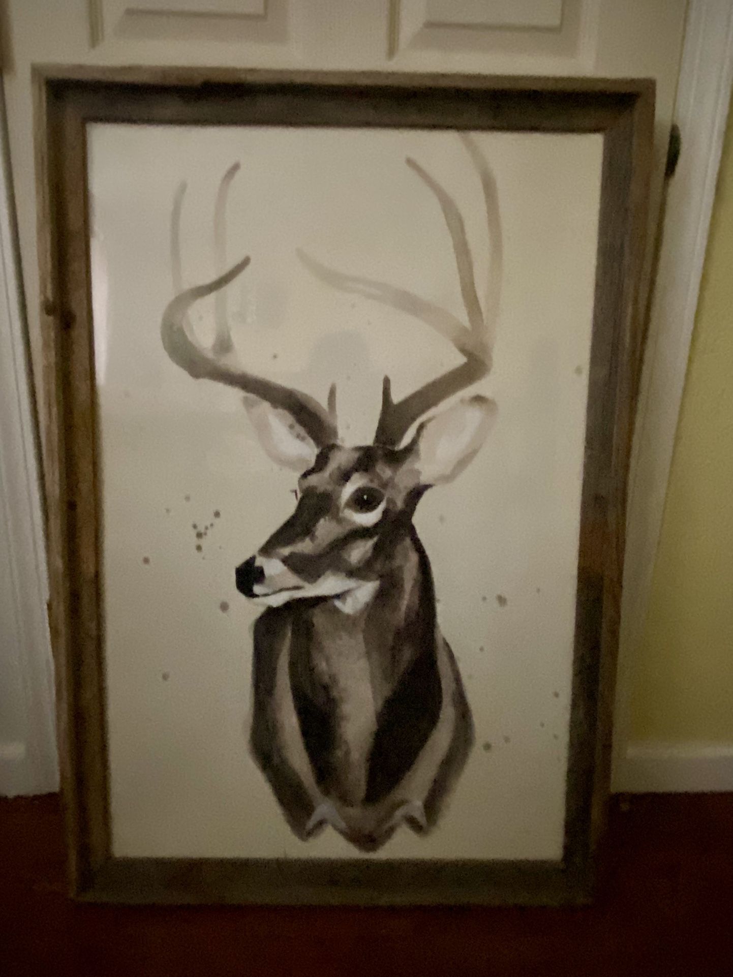 Rustic deer wall art. It’s pretty large. The wood is rustic and raw.