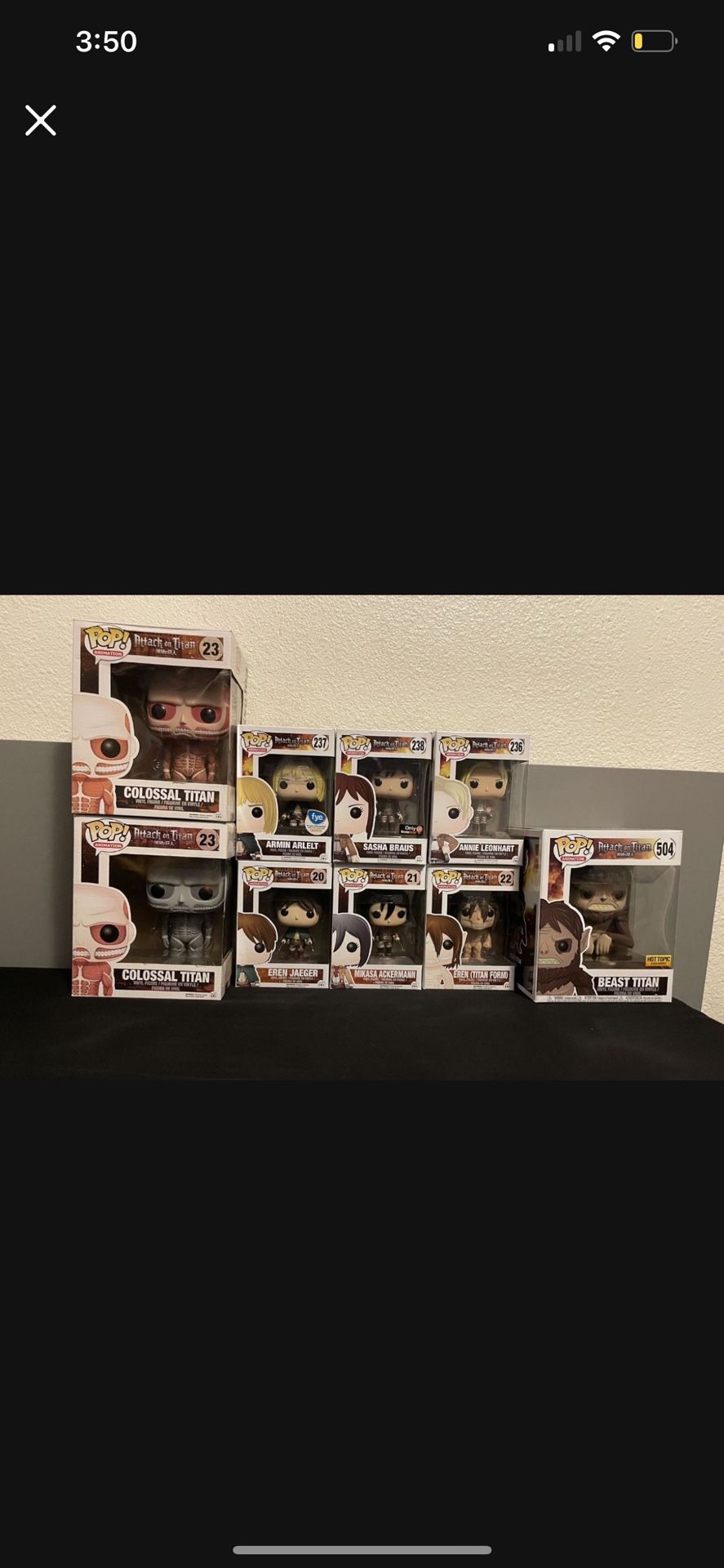 Different prices or best offers. Let me know which ones you are interested in. Will trade for other funkos (mainly looking for Five Nights at Freddy) and one piece cards (local only) Attack On Titan Funko Pop Eren $75 Eren Titan $150 Mikasa $110 Armin $135 Sasha $110 Annie $140 Colossal Titan $170 Colossal Titan (BW) $190 Beast Titan $165 Pick up only Can ship Funko Pop Grails, Anime, One piece, Sword Art Online, Naruto, Dragon Ball, Bleach, Tokyo Ghoul, Demon Slayer, Attack on Titan, My Hero Academia, Hunter x Hunter, Cow Boy bepop, Death Note, Fire Force, Evengelion, Seraph of the End, The Last of Us, Stranger Things, Breaking Bad, WWE, GI Joe, brook shared, Funko chase.