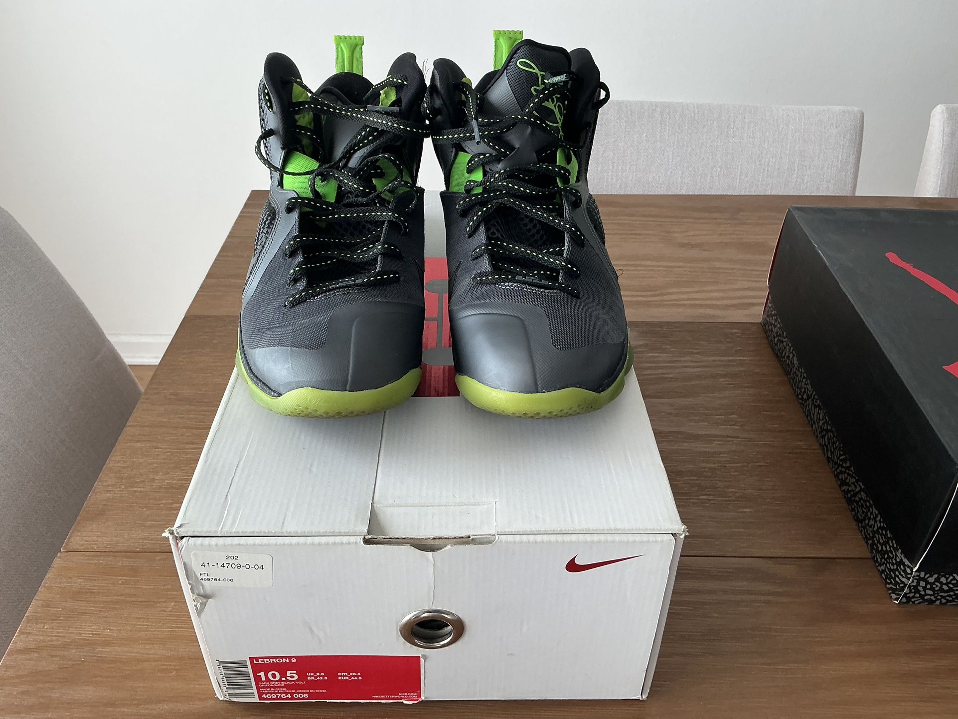 Used in size 10.5 Elevate your game with the Nike LeBron 9 Dunkman sneakers, a perfect blend of style and performance. Sporting a sleek Dark Grey and Black-Volt colorway, these shoes are designed to make a statement on and off the court. The iconic silhouette, coupled with the renowned comfort and durability of the Nike brand, ensures that these sneakers are a versatile addition to any athlete's collection. The LeBron 9 is part of the revered Nike LeBron product line and was released in 2012, marked by the style code 469764-006. This particular pair, in US size 10.5, caters to men who appreciate the fusion of modern design and athletic functionality. Whether you're aiming for a dunk or simply navigating your day, the Dunkman is engineered to support your every move.