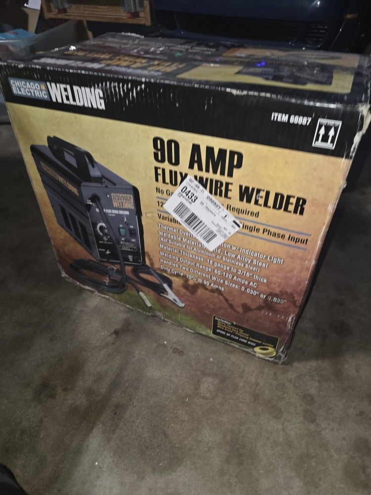 Brand New: CHICAGO 90 AMP FLUX WIRE WELDER No Gas or Regulators Required 120 Volt, 60 Hz, 20 Amp, Single Phase Input Variable Speed Control Material Thickness: 18 Gauge to 3/16" thick