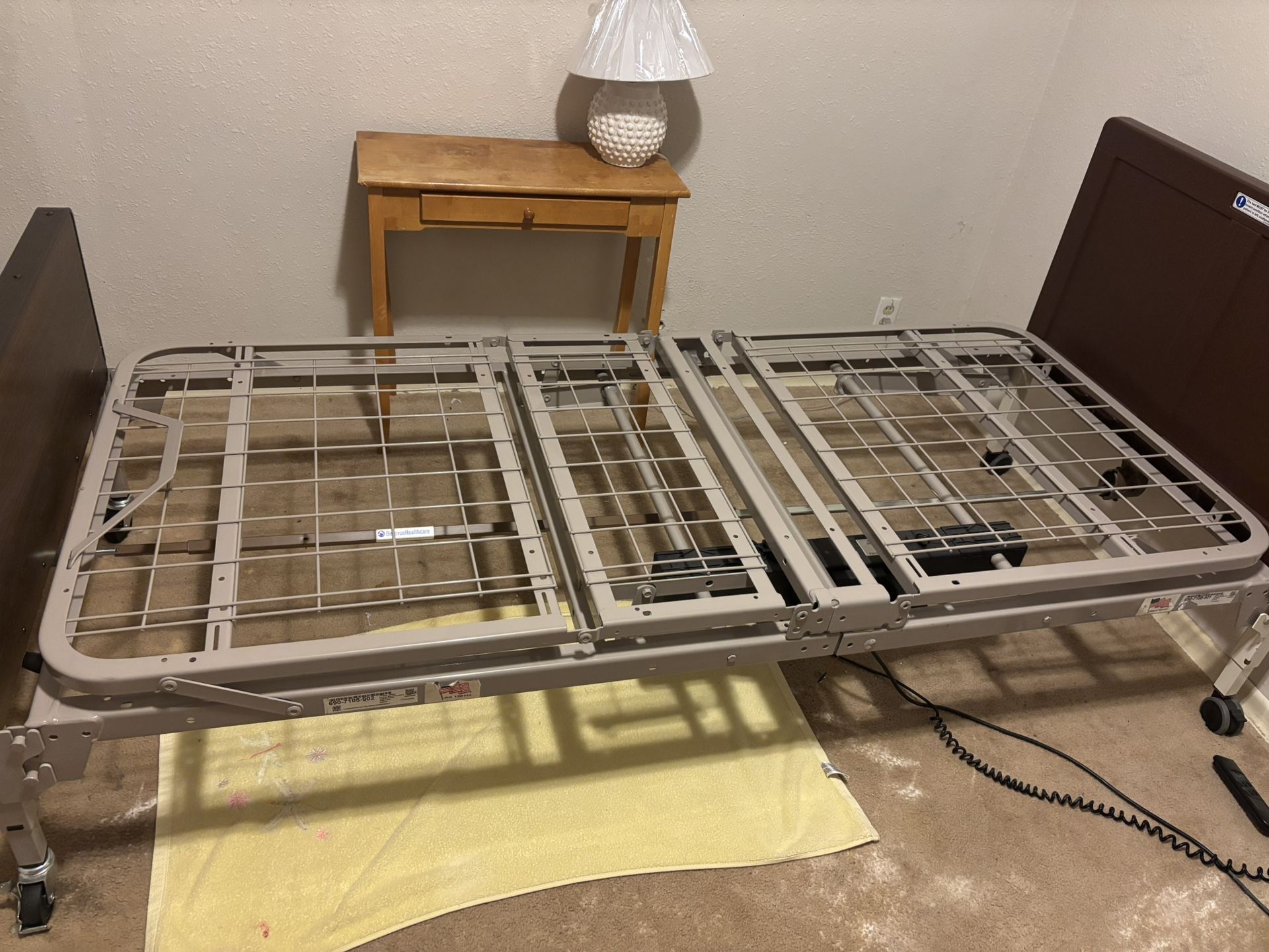 IN LIKE NEW CONDITION, WORKS GREAT, ADJUSTABLE HOSPITAL BED , LAYS FLAT POSITION, SITTING UP POSITION, AND LEGS ELEVATED POSITIONS AS WELL. ALSO AN ADJUSTABLE INFLATABLE MATTRESS FOR PREVENTING BED SORES
