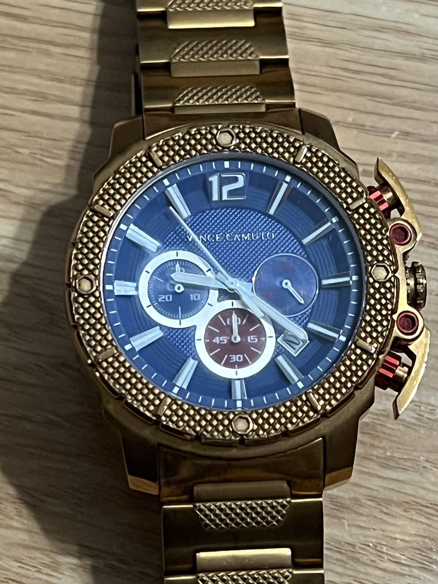 Elevate your style with this sleek and sophisticated Vince Camuto men's dress watch. The round gold bracelet complements the silver dial, which features an analog display and a striking bronze bezel. This watch is water-resistant up to 165 feet, making it perfect for any occasion. The stainless steel case is durable and long-lasting, while the 14mm case thickness ensures a comfortable fit. Excellent condition Needs a new battery