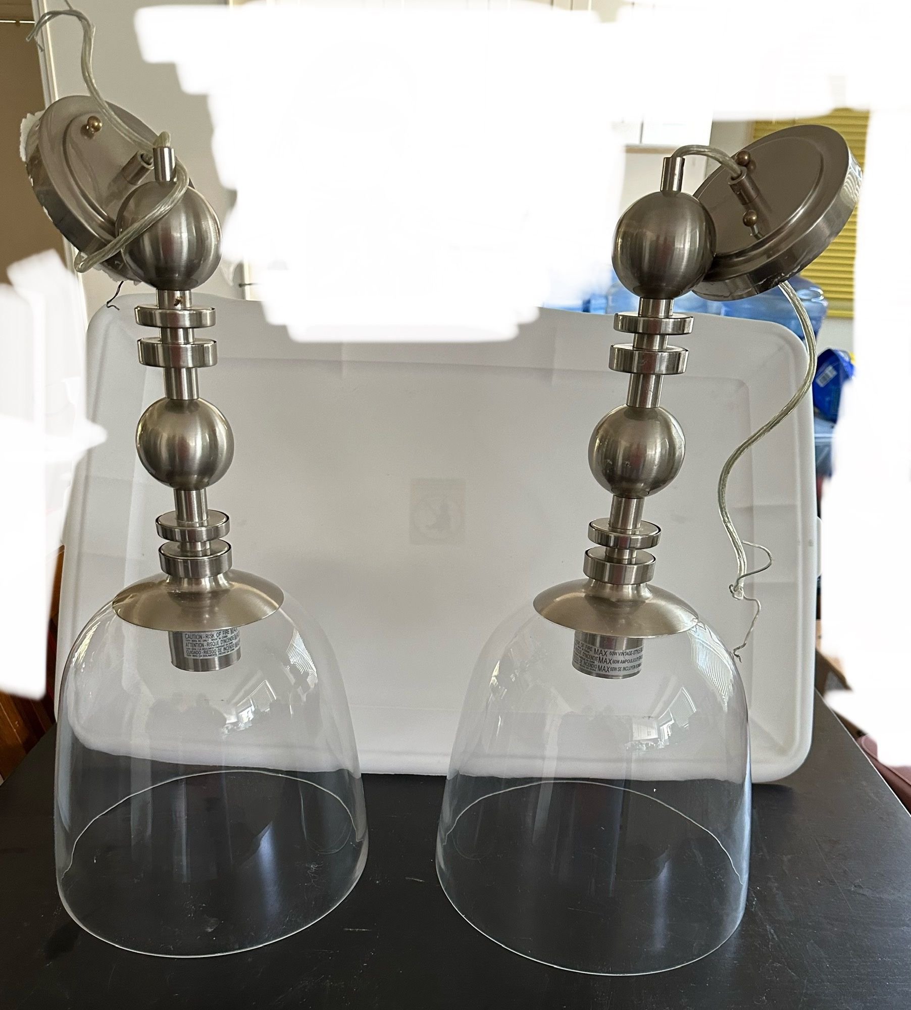 Two Large hanging dome glass lights. Need a little cleaning but work. Clear glass