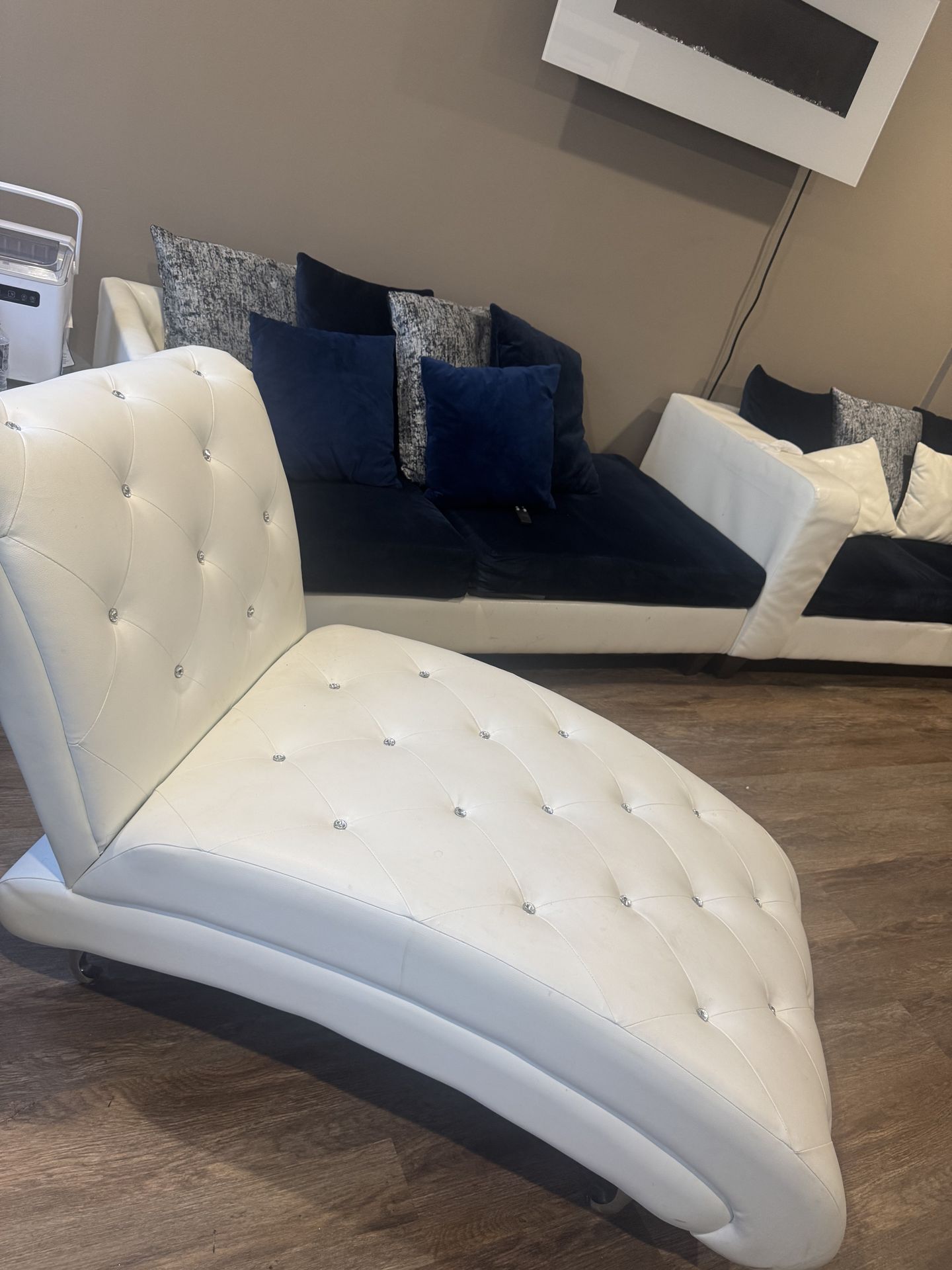 L shape white leather and blue suede couch with pillows. White leather chair with white fire place with remote. Must be gone by the 15th of April. Pick up only.