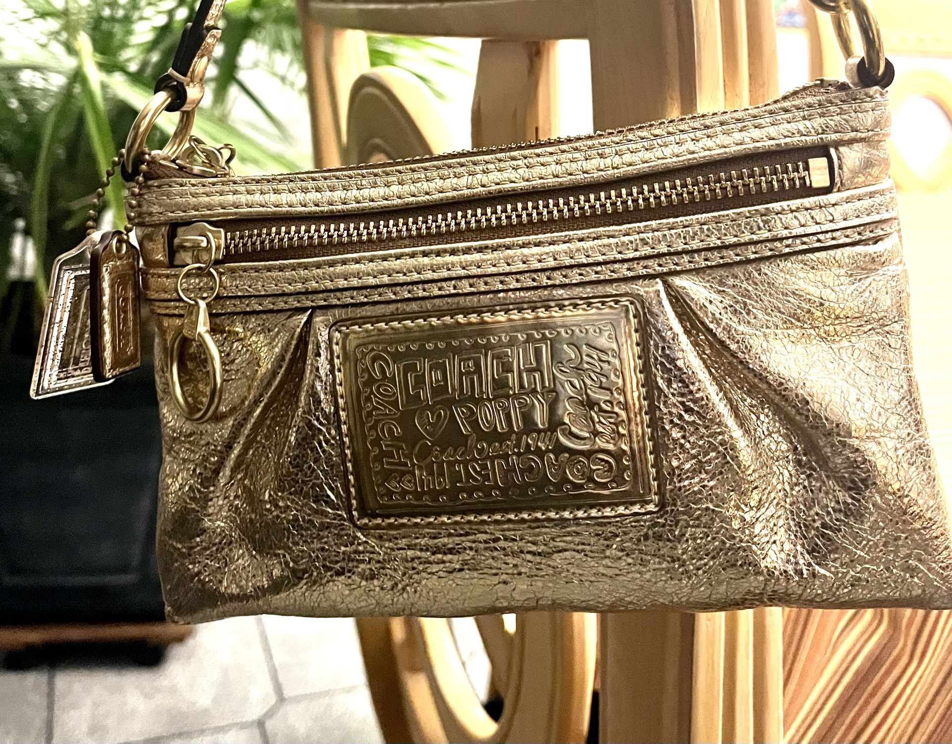 Authentic COACH clutch with strap. Made of leather gold tone and satin inside. The side of bag it has two hanging coach tags. ****This bag is new and has never been used,**** still in the original coach box!***** Every corner of the bag is in perfect condition as seen in pics. Absolutely no wear spots, including on the arm strap. Bought as a gift and never gave it. It has one outer pocket, both zippers are gold tone. Measurements…5” long, 8” wide, strap is 5” long. ****In pics are comparison photos for sale.