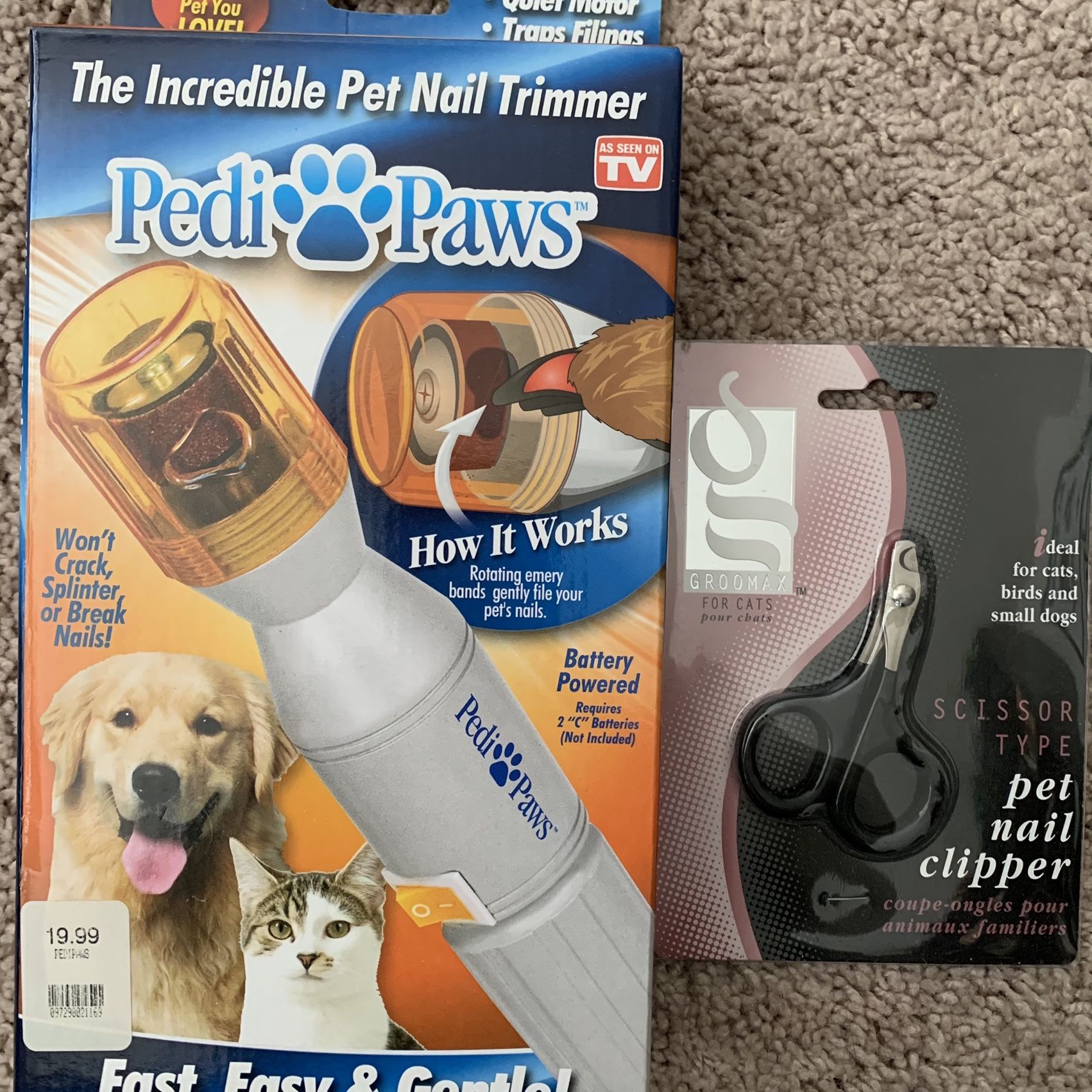 New in box @$19.99. Asking $15.00. Battery powered pet nail-trimmer with instruction pamphlet and 4 emery bands. Will include scissor type-pet nail clipper (9.00 value) for small dogs, cats, or birds.