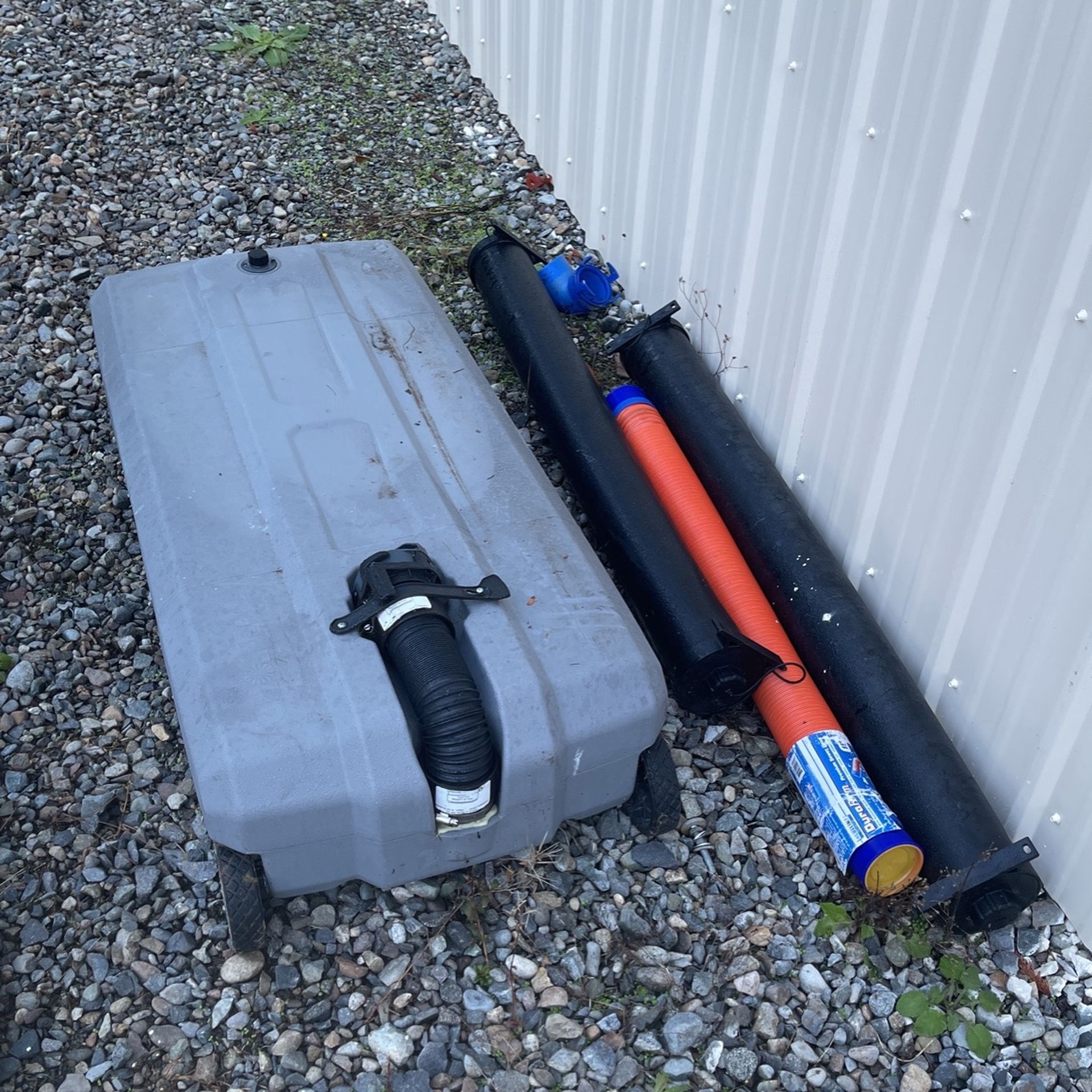 7 items Mobile sewage tank for RV Elbow 3 duraform extending sewer hoses 2 storage tubes for hoses I paid almost $200 for just the tank Sold my RV