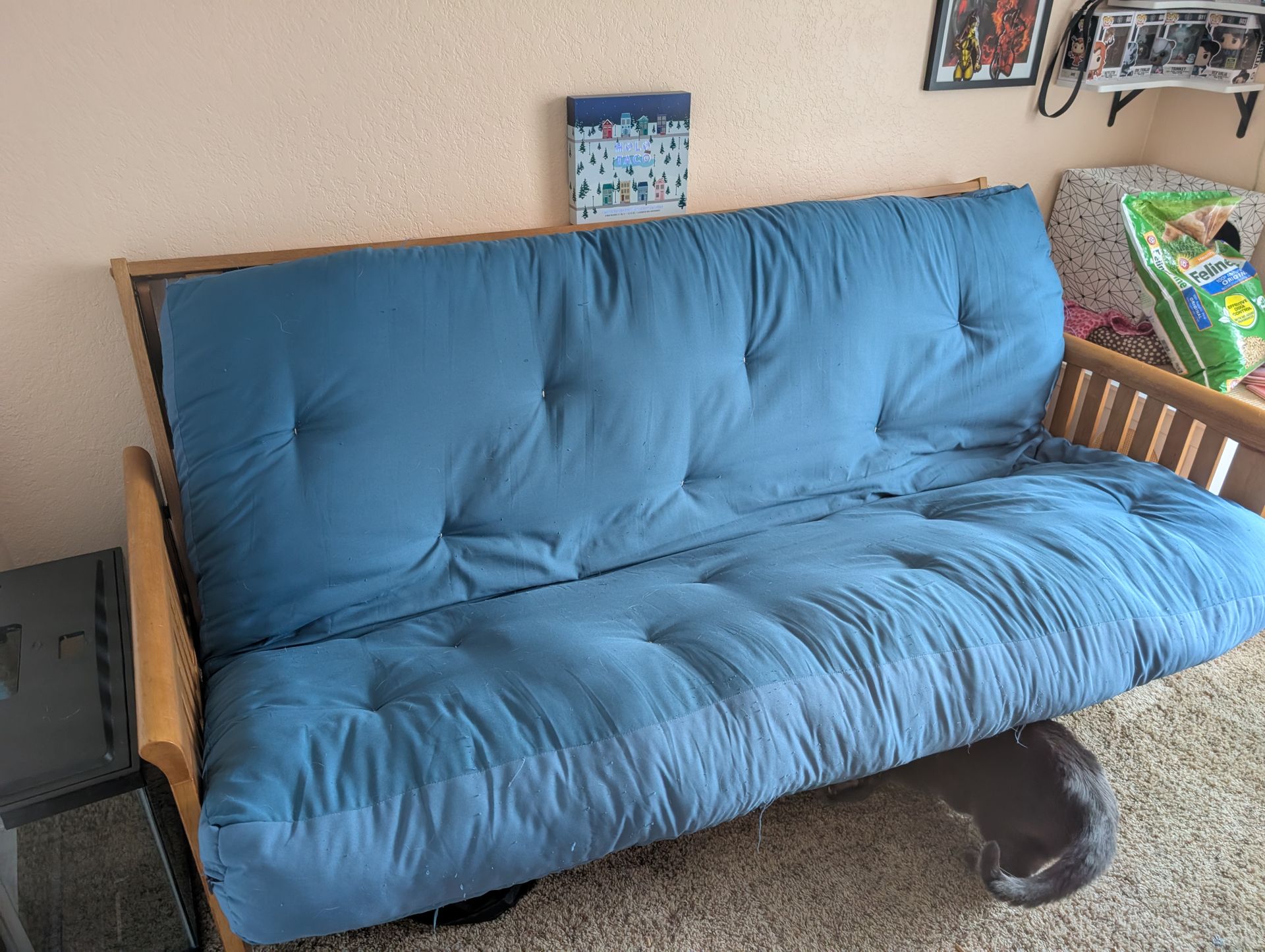 Great futon with comfy memory foam mattress. A few snags on the mattress from cat scratches, but with a cover it will be wonderful. Excellent for a guest room-- it's been in my home office for when I have friends stay over.