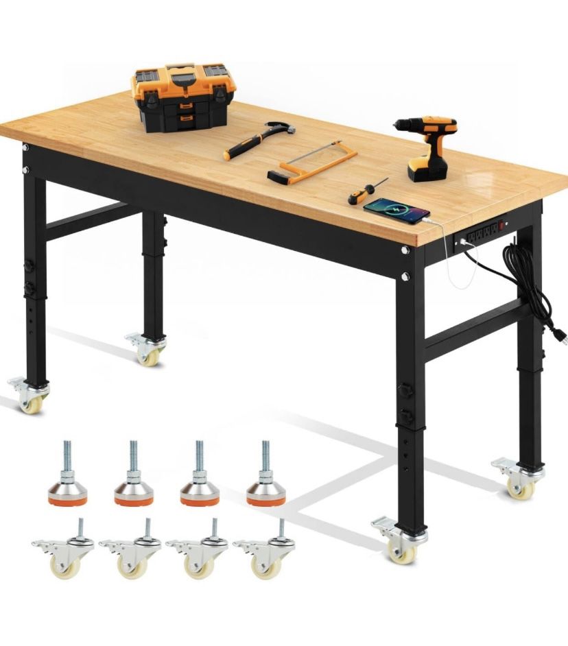 60-inch adjustable workbench, heavy-duty workstation with power outlets, rubberwood top work table for garage, workshop, home, commercial use.