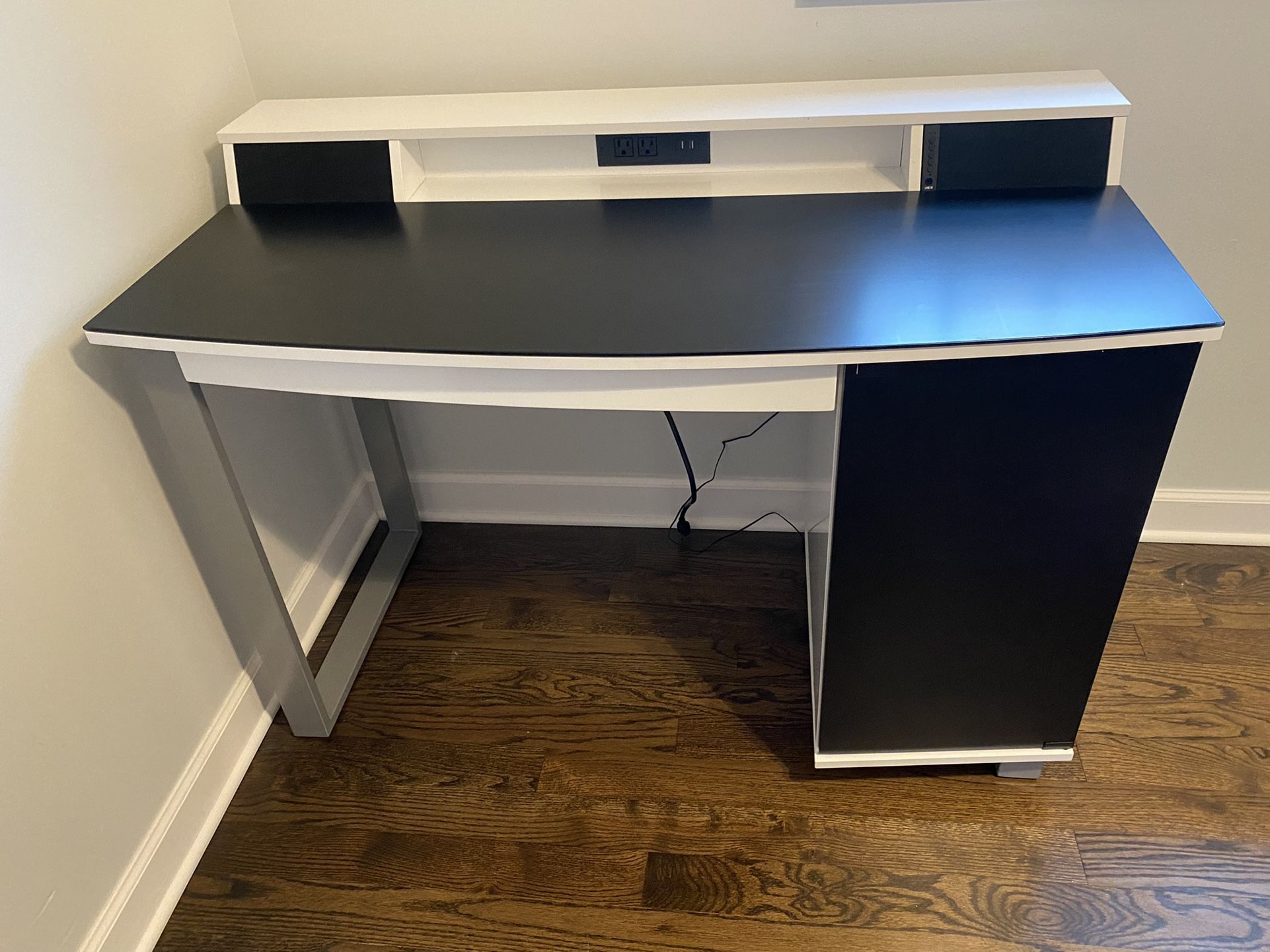Finely made office desk with glass top, blue tooth speakers, filing cabinet, and storage! Comes with two outlets to plug in laptop and your student /you can hook up to the Bluetooth speakers (all in working condition) to jam out during your study sesh or listen to that ebook! Will take offers, but no low balls! If you’re coming to pick it up, there is no changing your mind. Serious buyers only, my house isn’t a gallery for you to walk through. Will deliver it myself but it’ll be extra. Office desk, dorm desk, study room, desk, furniture, office furniture, bedroom furniture.