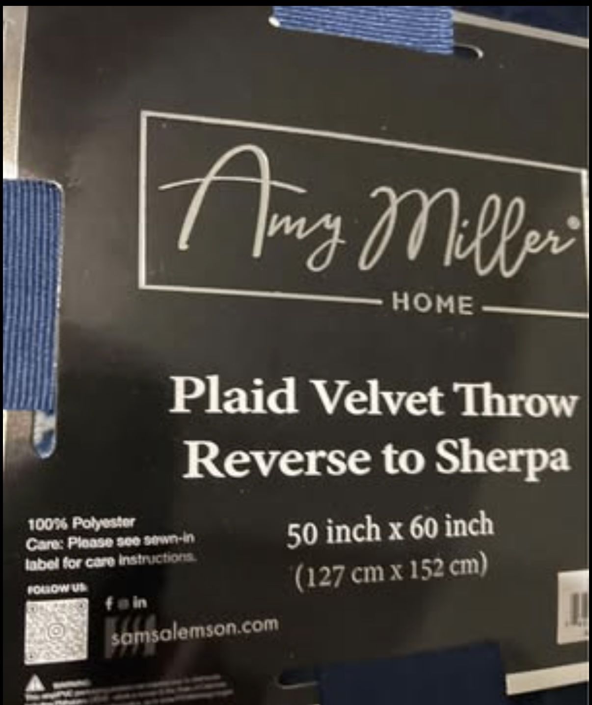 Amy … Miller .. Home …. Plaid .. Velvet … Throw . Reverse to …. Sherpa … Navy / Blue …. Very soft . Size —- 50” x 60” .. Pretty … Throw … Last .. One .. Great … Gift .. Brand .. New !! Questions .. ask Shipping … Available Cash .. Only ! Pickup SALEM , VA