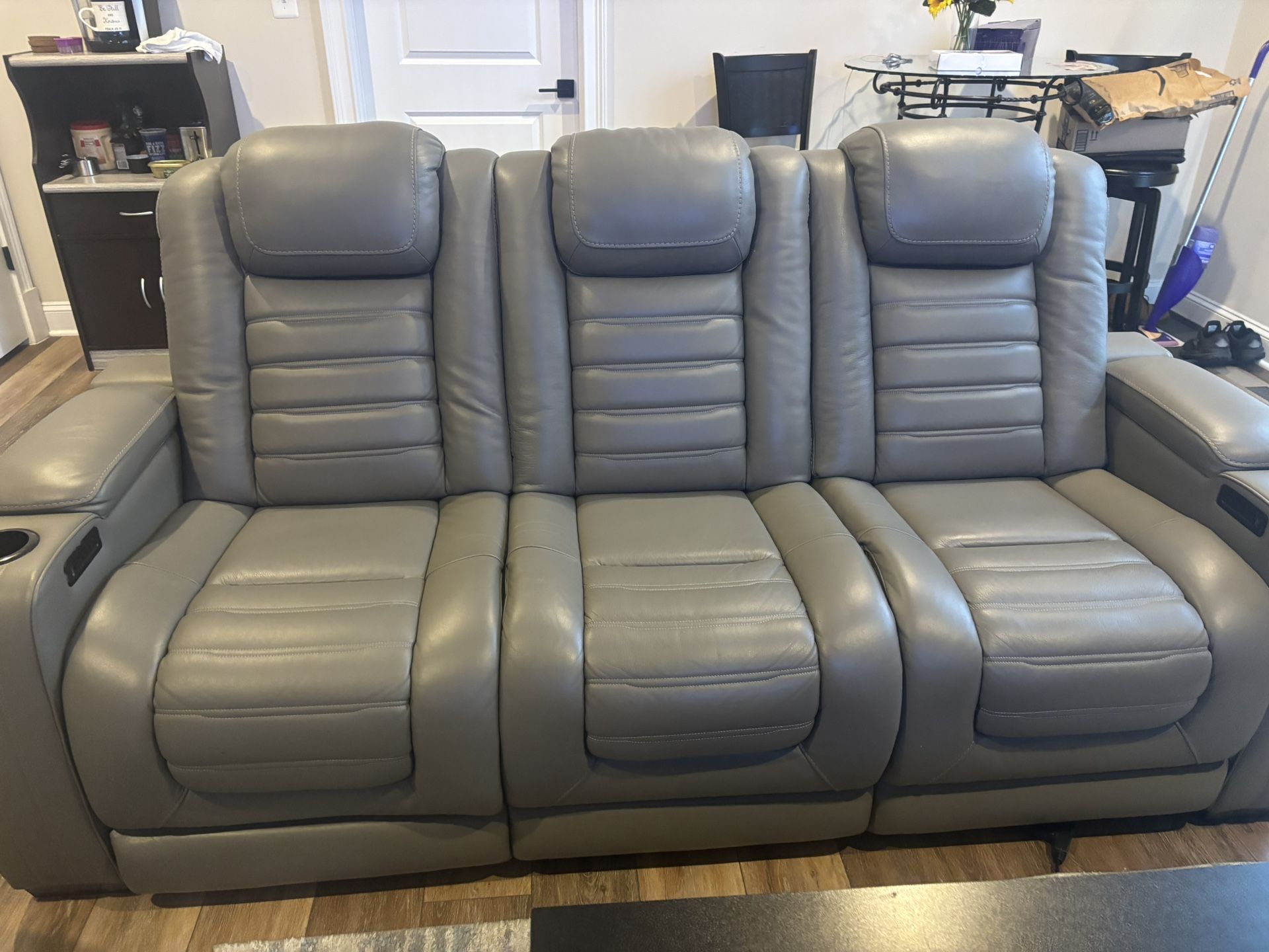 Gray Sofa 3 seater that has electrical recliner and heated message. Plus usb port and storage Cream moon chair with pillows Black Coffee / desk table Bought 2 years ago, fairly new and in very good condition