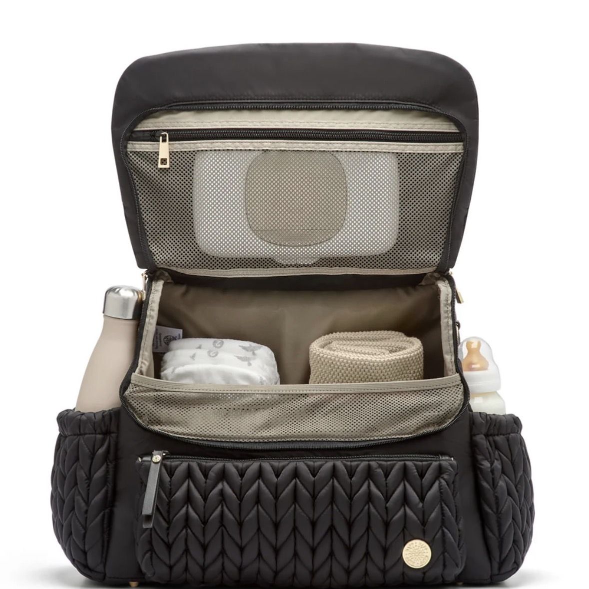 One-time use Zippered main flap that opens wide so you can see everything inside 1 zippered front pocket 4 interior pockets 1 interior mesh zipper pocket 2 quick-grab exterior bottle pockets 1 exterior back pocket with magnet closure Water-resistant nylon fabric protects against spills Cushioned backpack straps Comes with additional detachable, adjustable, nylon cross-body strap Structured bottom with metal feet Reinforced nylon top handles 17"L x 6"W x 12"H Handle drop: 3" Featherlight weight: only 1.9lbs! Each bag is handcrafted