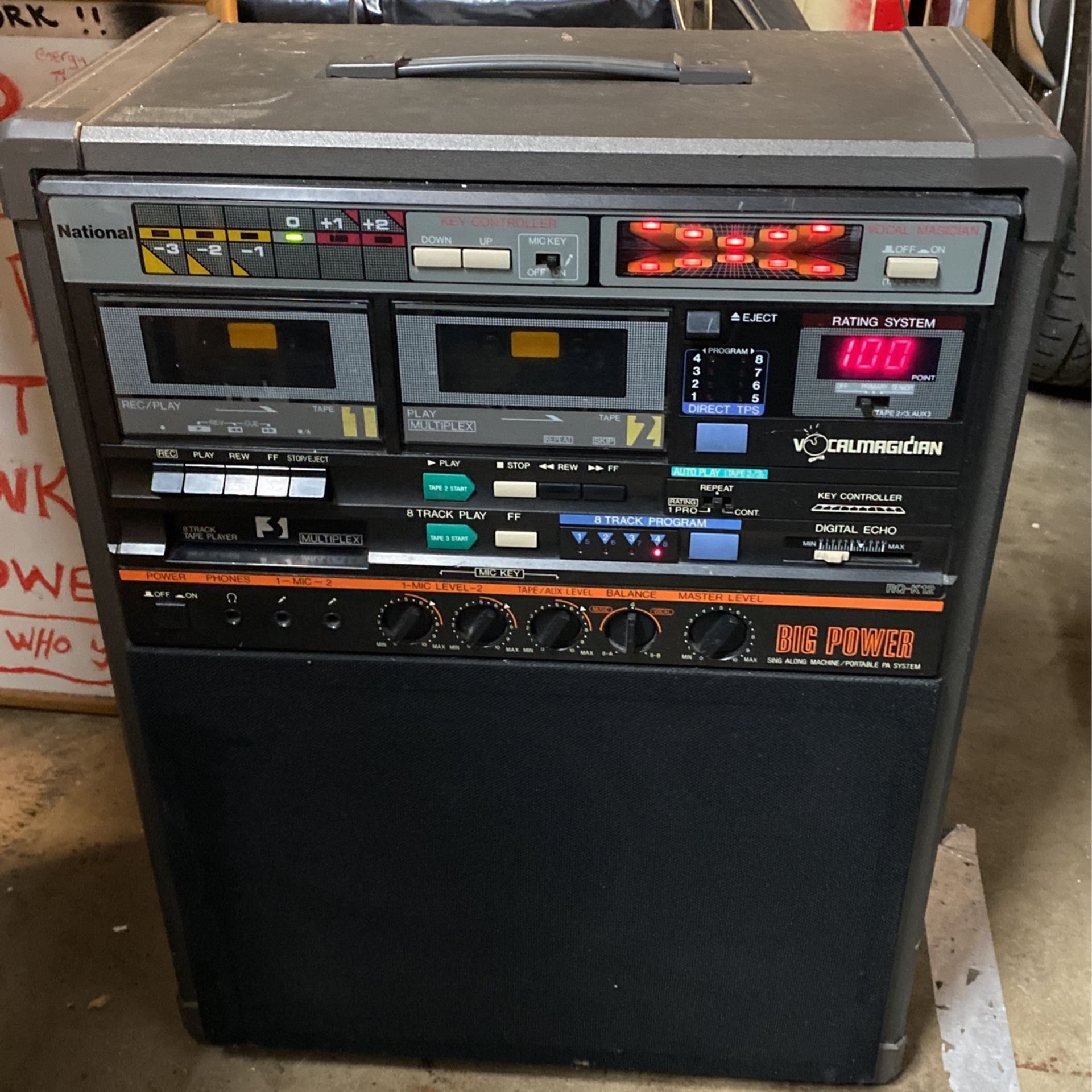 Vintage karaoke machine with 8track player and dual cassette deck. Dont know much about this . Found at estate sell. I have only tested for power FWD RWD all seem to work when buttons pressed . Selling as is for anyone who wants to most likely put some repair work into it. Cosmetically clean and nothing major in scratches or scuffs marks. Just normal stuff and for the age of it looks very presentable. Throw me an offer all offers considered and or accepted. Need it gone . Need more space.