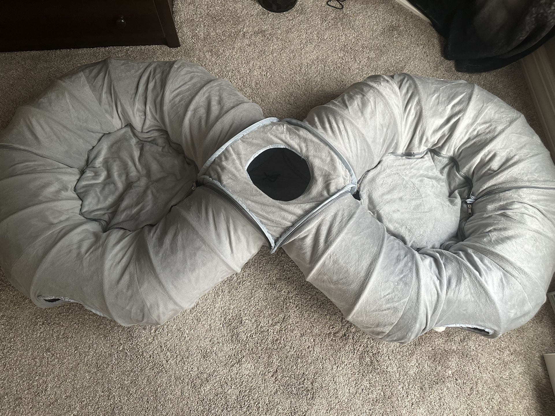 Brand New Pawaboo 2-in-1 Cat Tunnel Bed. 8-Shaped Large Cat Tunnels w Plush Cushions. Foldable Cats Cave Hideout. Dimensions are 68.9”L x 31.5”W x 11.81”H. Brand New Only Used Once for Demo Purposes. Sells for $54.99 Online.