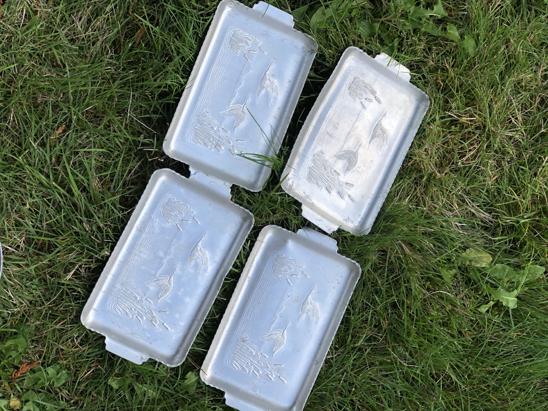 Small aluminum platters. 4 rectangular and one circular one with ducks or geese engraved.