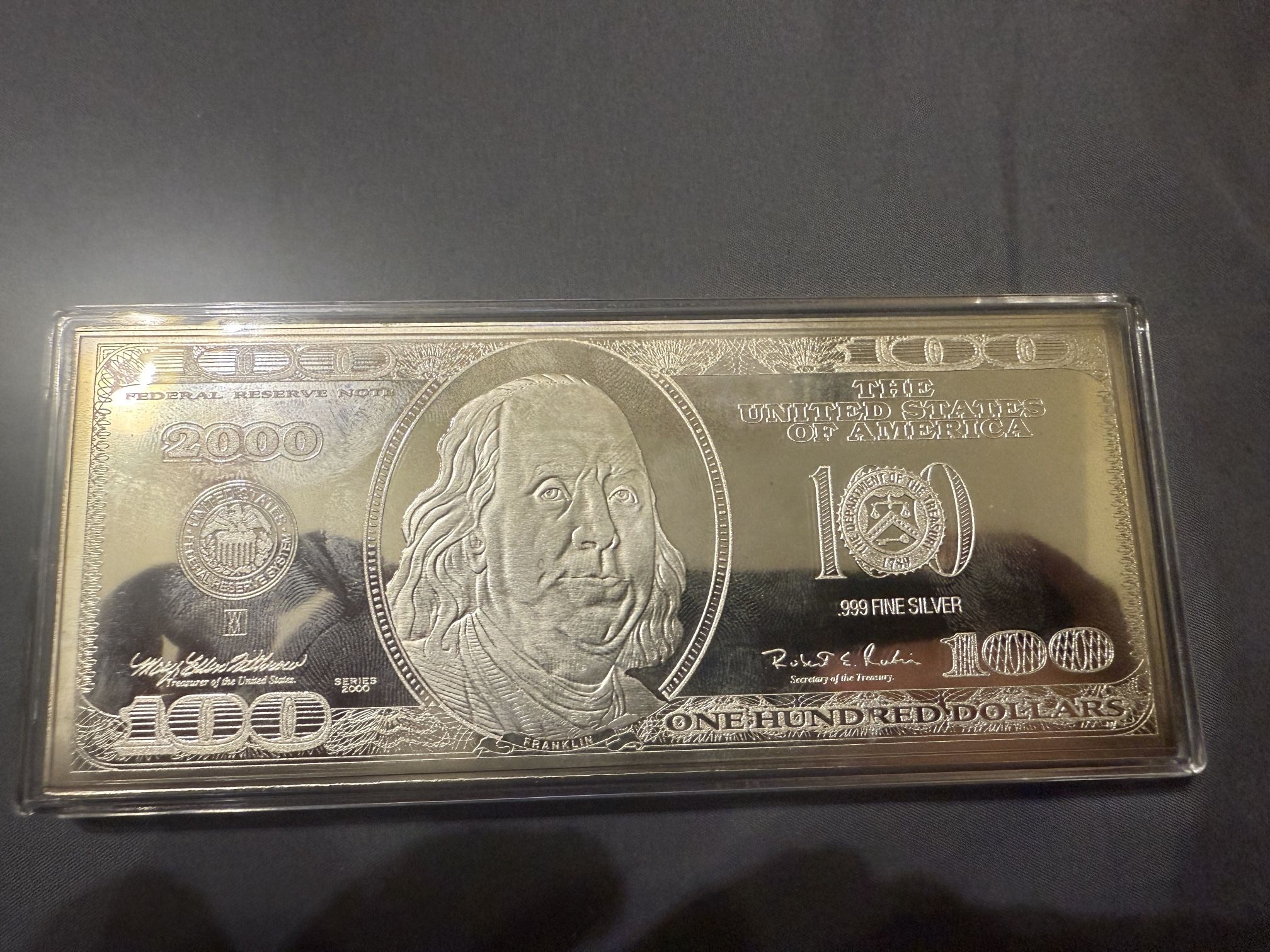 Description: Beautiful $100 Franklin Silver Proof bar from The Washington Mint (2000). Contains 4 oz of .999 fine silver, proof finish. Comes sealed with original Certificate of Authenticity. Limited mintage of 100,000.