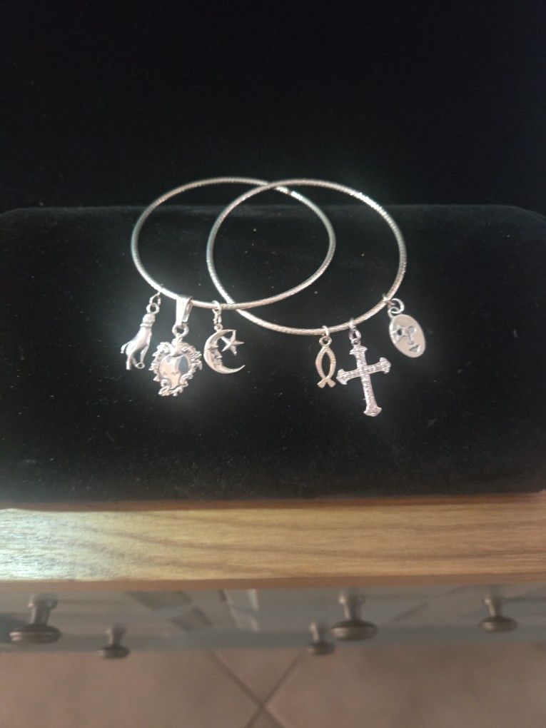 2 interlocking bangles, each with 3 charms, hand, half Moon, heart, diamond accent cross, spiritual fish, face, all sterling silver charms. Sz- 7- 7.5in