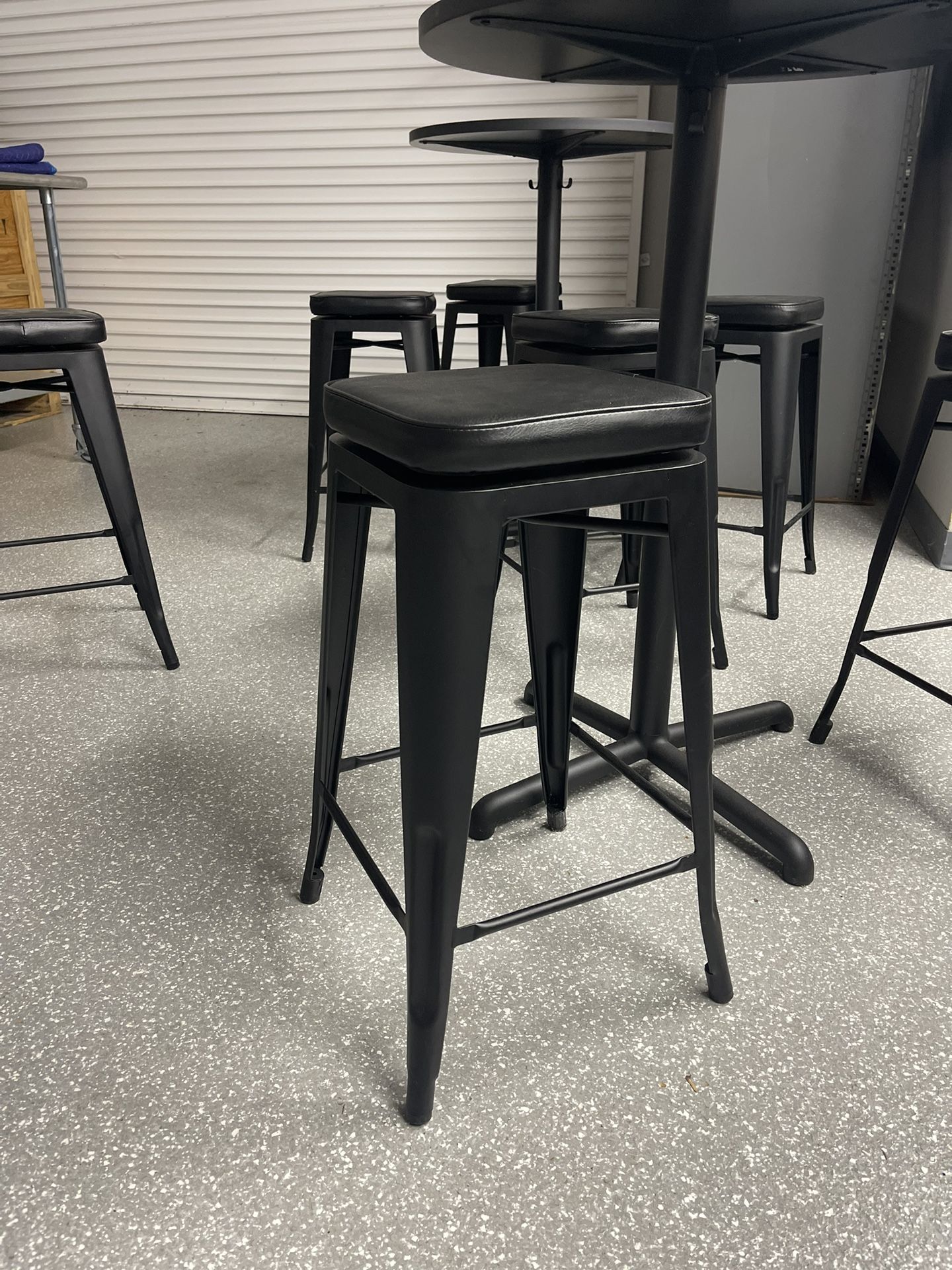 Very lightly used bar tables and bar stools for sale. Items are like new! 3 Padded Bar Stools - $65.00 each Black cushion Dark metal legs 27.5 inch high Also available: 3 Bar Tables - $140.00 each or $375 for 3 41.5 inch high 27.5 inch top diameter Black- Antracite