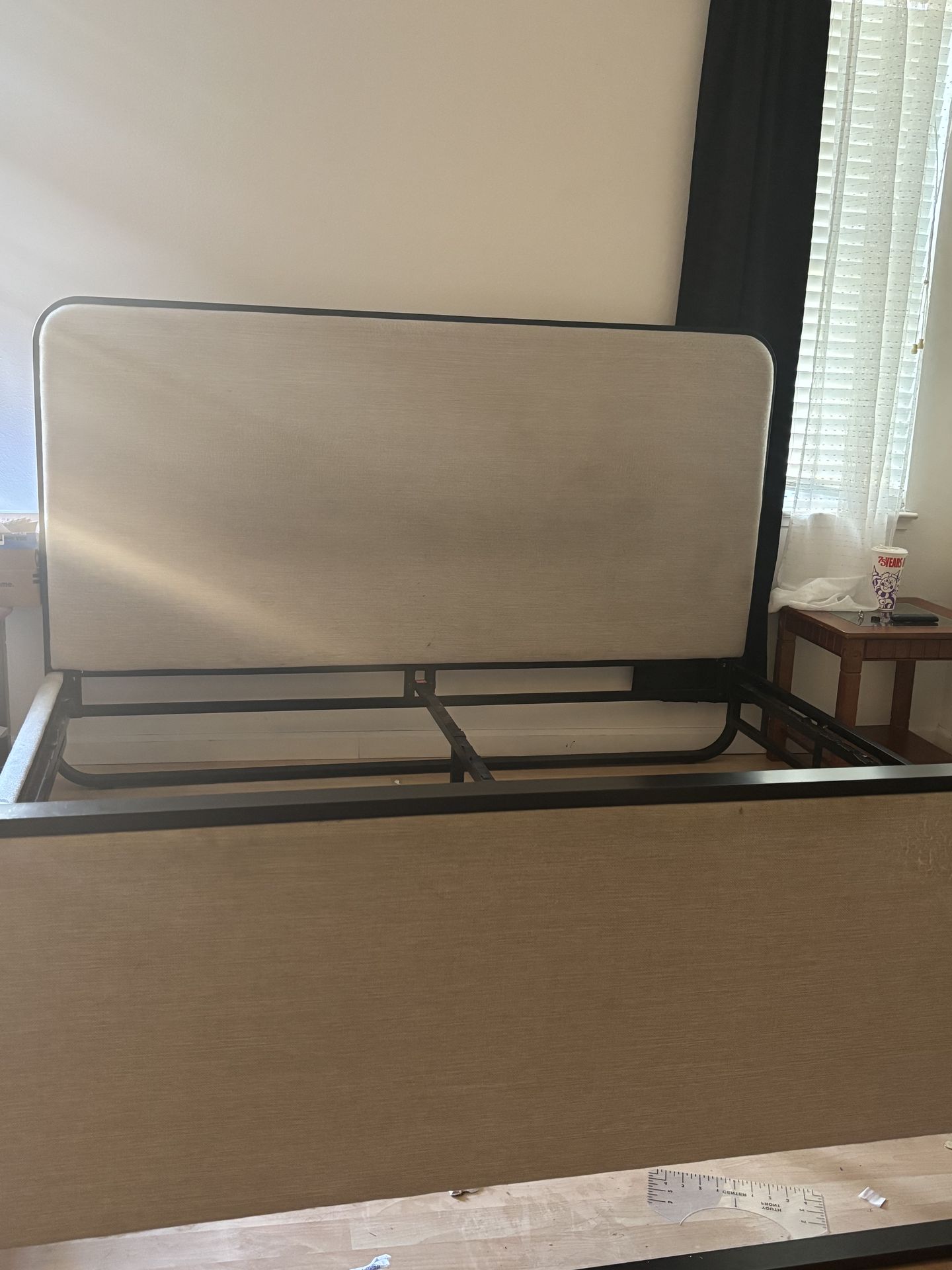 Two years old the frame is black metal with gray cushion part the gray cushion part needs to be cleaned as I usually keep my windows open and dirt does fly in. I don’t have time to clean it so that’s the reason why I’m letting it go for $40. The bedframe was purchased for $900 although it’s used it’s getting a great deal.